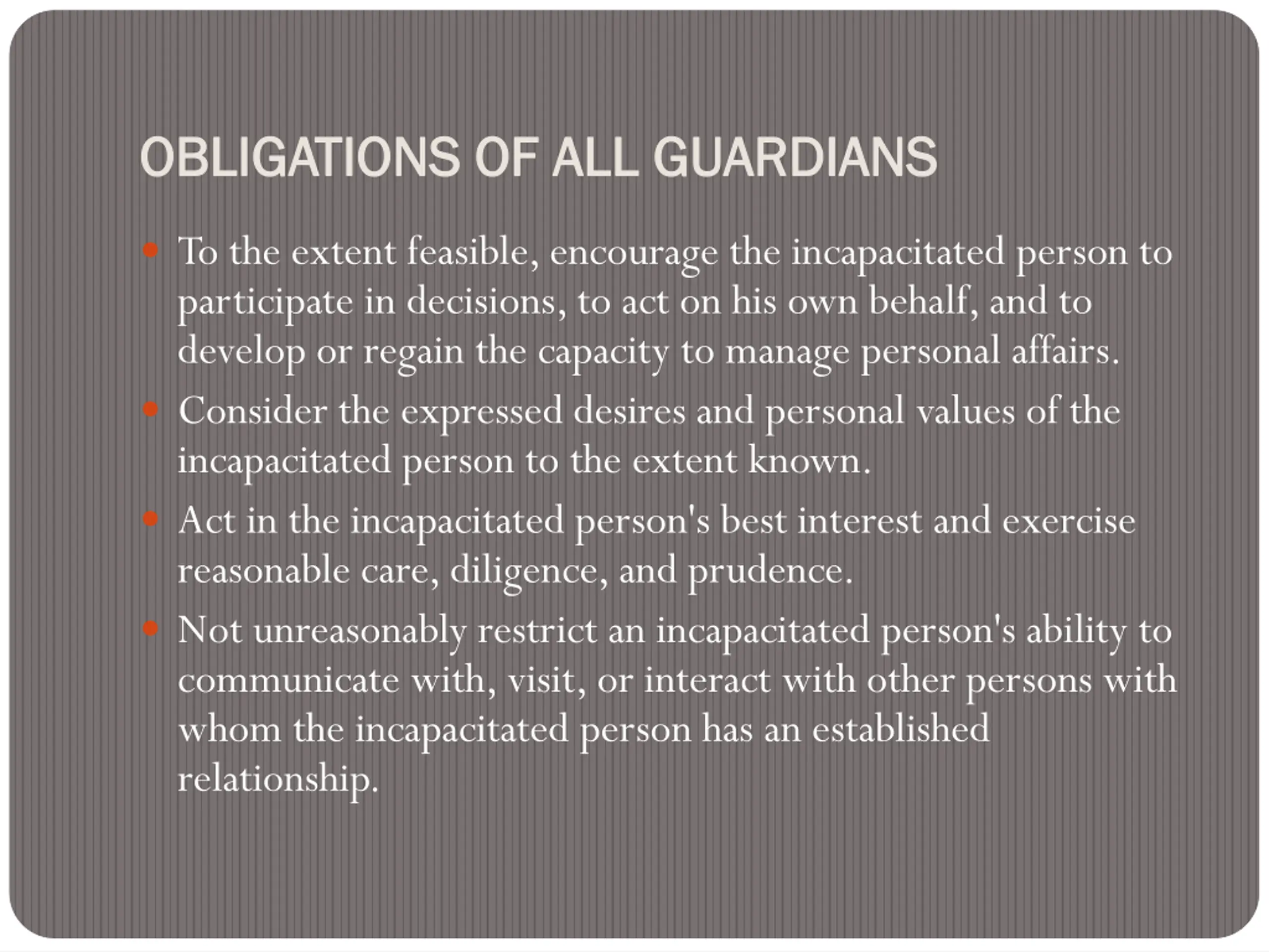 OBLIGATIONS OF ALL OBLIGATIONS OF ALL GUARDIANS GUARDIANS To the extent feasible, encourage the incapacitated person to participate in decisions, to act on his own behalf, and to develop or regain the capacity to manage personal affairs. Consider the expressed desires and personal values of the incapacitated person to the extent known. Act in the incapacitated person's best interest and exercise reasonable care, diligence, and prudence. Not unreasonably restrict an incapacitated person's ability to communicate with, visit, or interact with other persons with whom the incapacitated person has an established relationship.