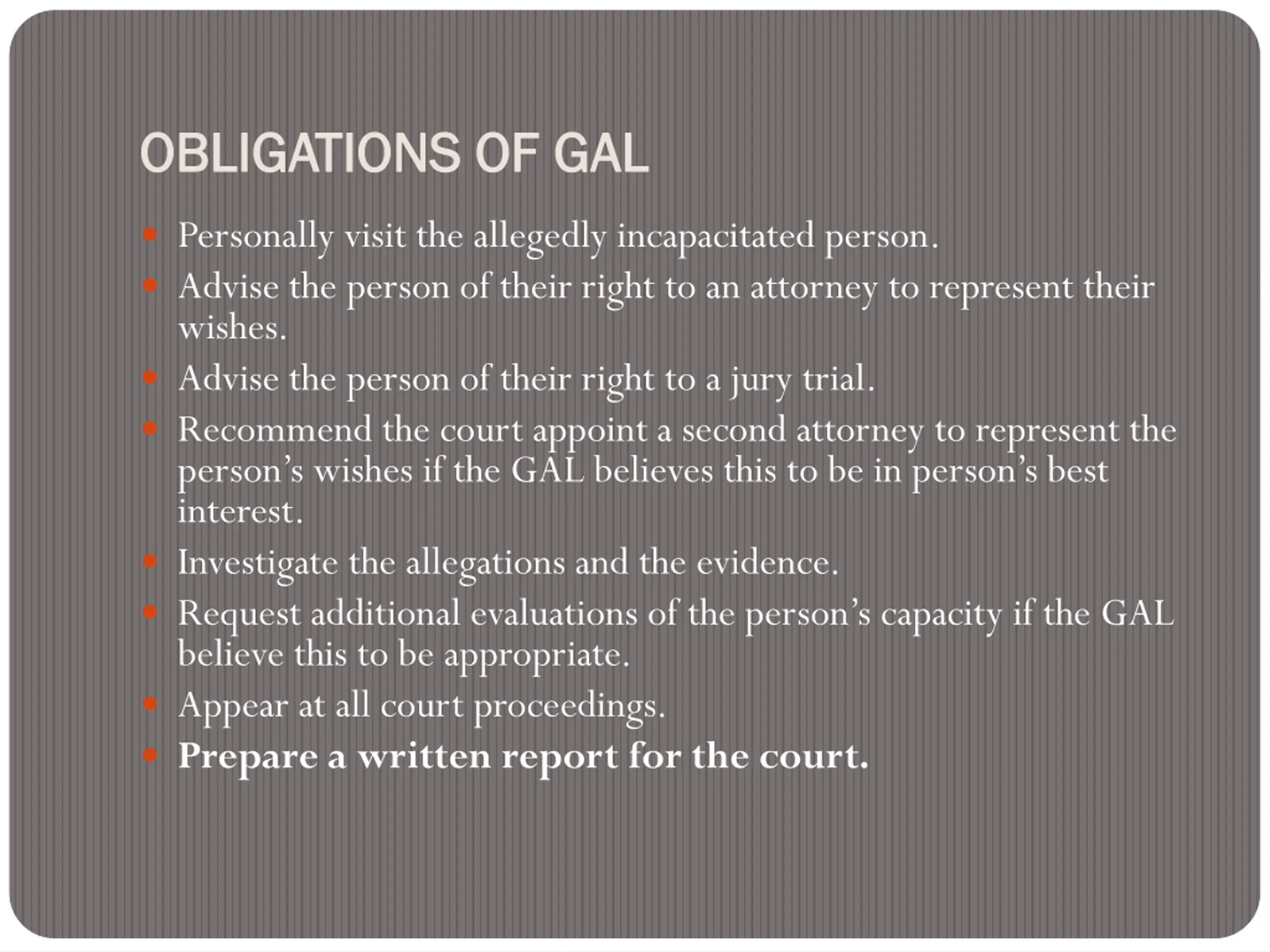 OBLIGATIONS OF OBLIGATIONS OF GAL GAL Personally visit the allegedly incapacitated person. Advise the person of their right to an attorney to represent their wishes. Advise the person of their right to a jury trial. Recommend the court appoint a second attorney to represent the person s wishes if the GAL believes this to be in person s best interest. Investigate the allegations and the evidence. Request additional evaluations of the person s capacity if the GAL believe this to be appropriate. Appear at all court proceedings. Prepare a written report for the court.