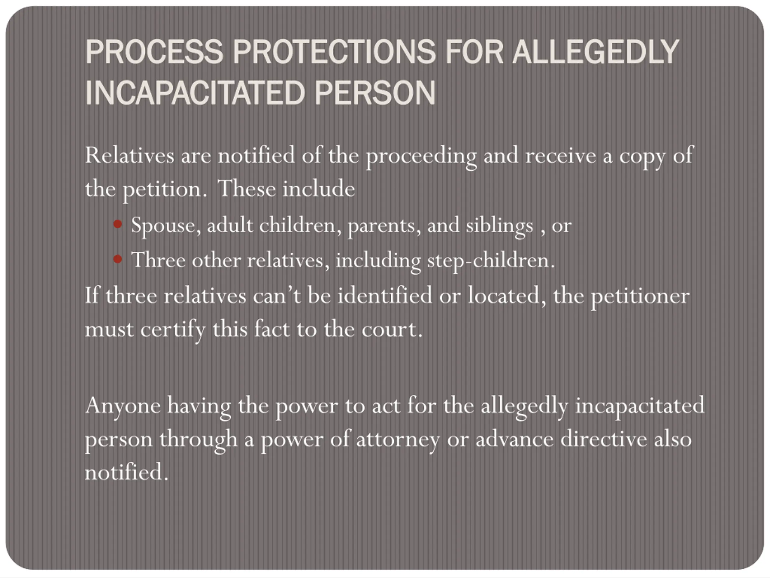 PROCESS PROCESS PROTECTIONS FOR PROTECTIONS FOR ALLEGEDLY INCAPACITATED PERSON INCAPACITATED PERSON ALLEGEDLY Relatives are notified of the proceeding and receive a copy of the petition. These include Spouse, adult children, parents, and siblings , or Three other relatives, including step-children. If three relatives can t be identified or located, the petitioner must certify this fact to the court. Anyone having the power to act for the allegedly incapacitated person through a power of attorney or advance directive also notified.