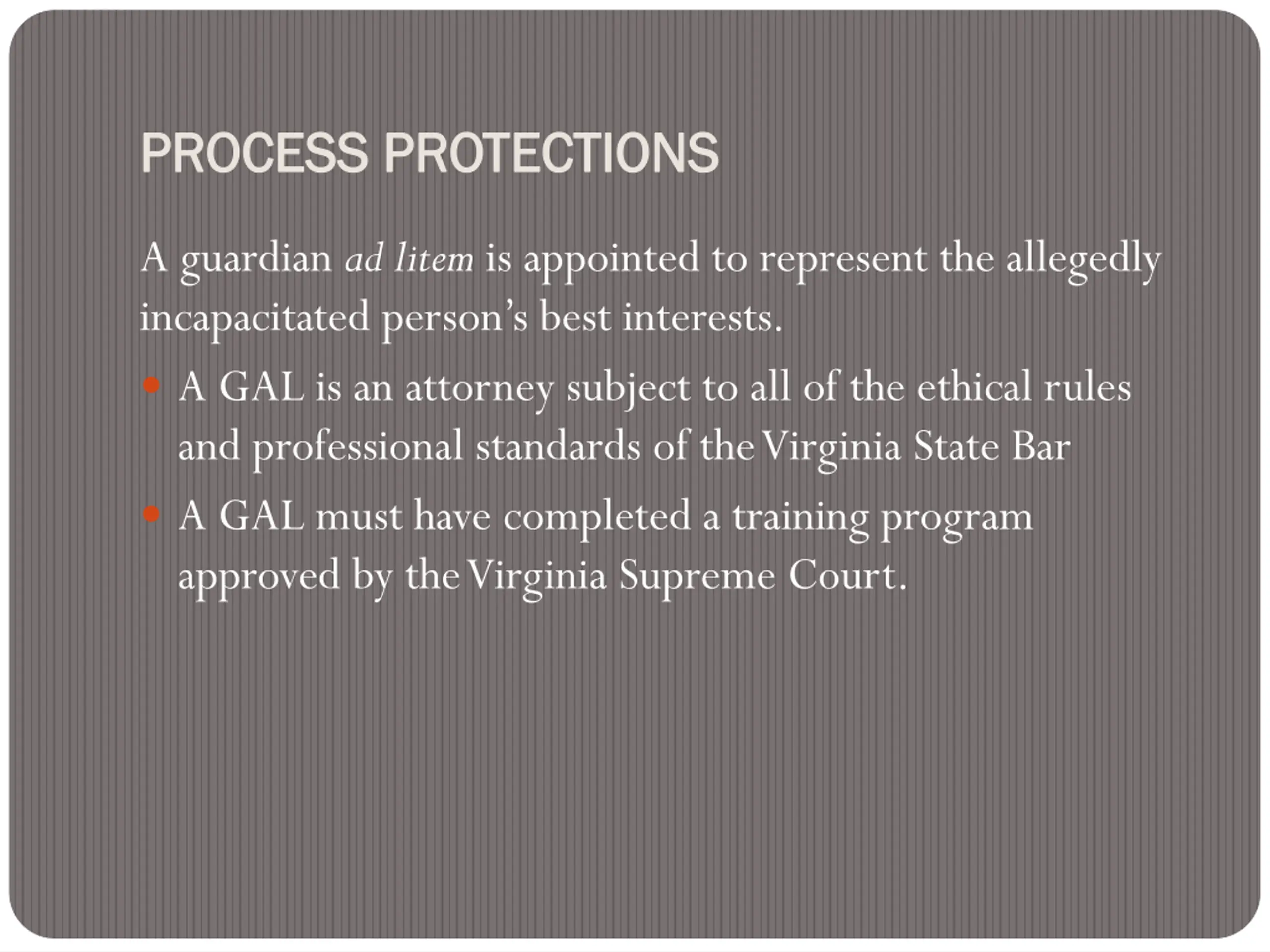 PROCESS PROTECTIONS PROCESS PROTECTIONS A guardian ad litem is appointed to represent the allegedly incapacitated person s best interests. A GAL is an attorney subject to all of the ethical rules and professional standards of the Virginia State Bar A GAL must have completed a training program approved by the Virginia Supreme Court.
