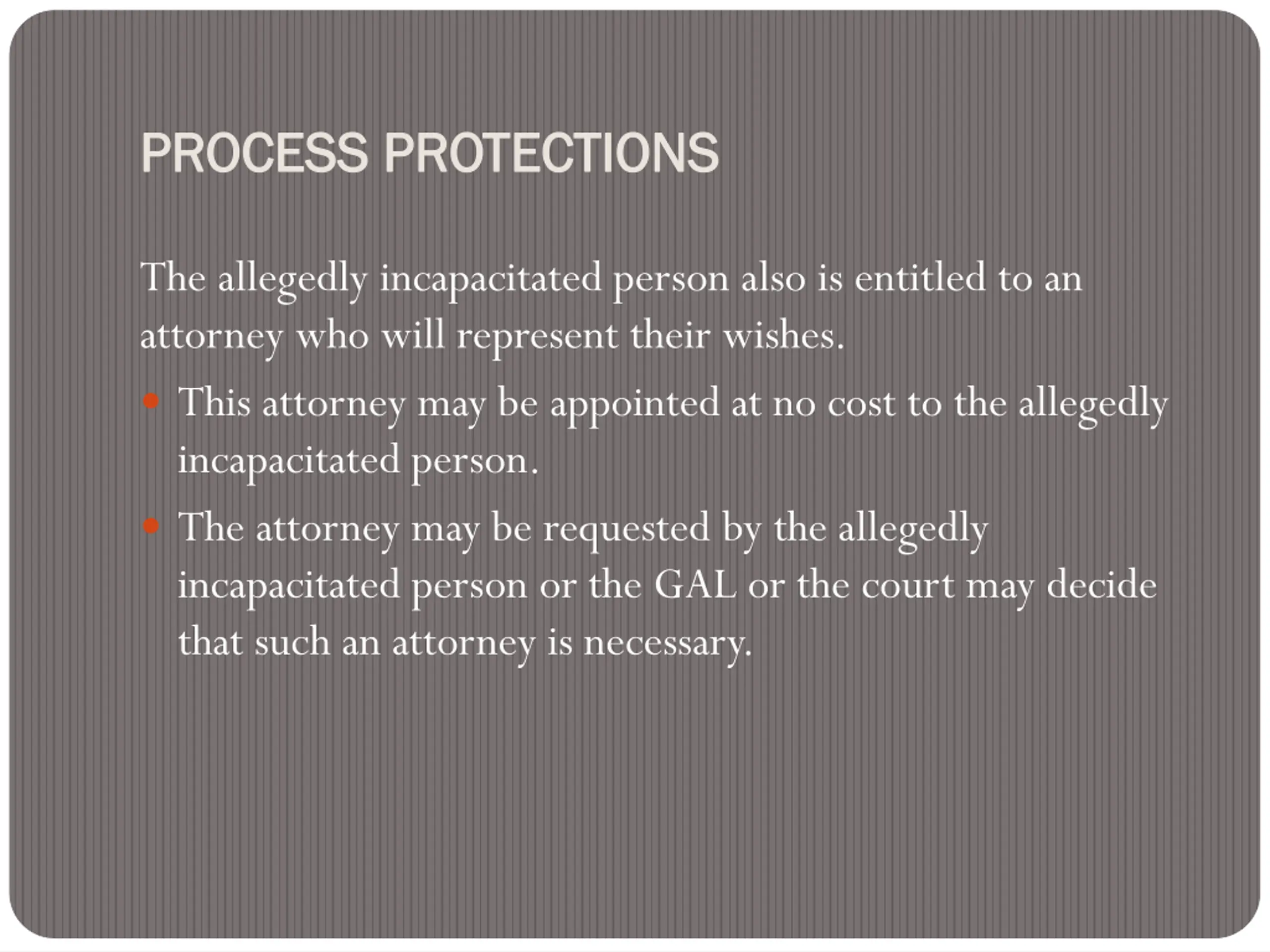 PROCESS PROTECTIONS PROCESS PROTECTIONS The allegedly incapacitated person also is entitled to an attorney who will represent their wishes. This attorney may be appointed at no cost to the allegedly incapacitated person. The attorney may be requested by the allegedly incapacitated person or the GAL or the court may decide that such an attorney is necessary.