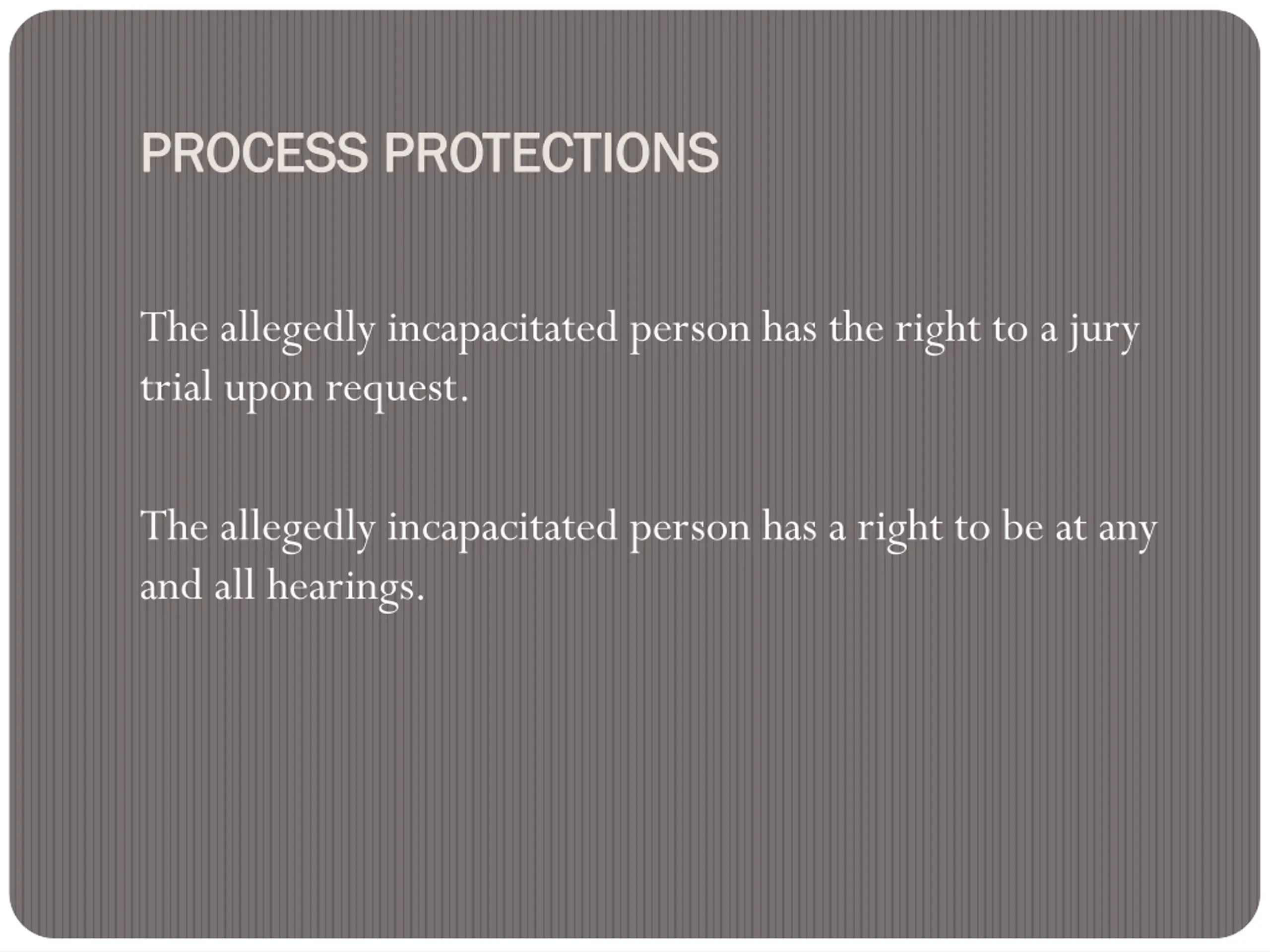PROCESS PROTECTIONS PROCESS PROTECTIONS The allegedly incapacitated person has the right to a jury trial upon request. The allegedly incapacitated person has a right to be at any and all hearings.