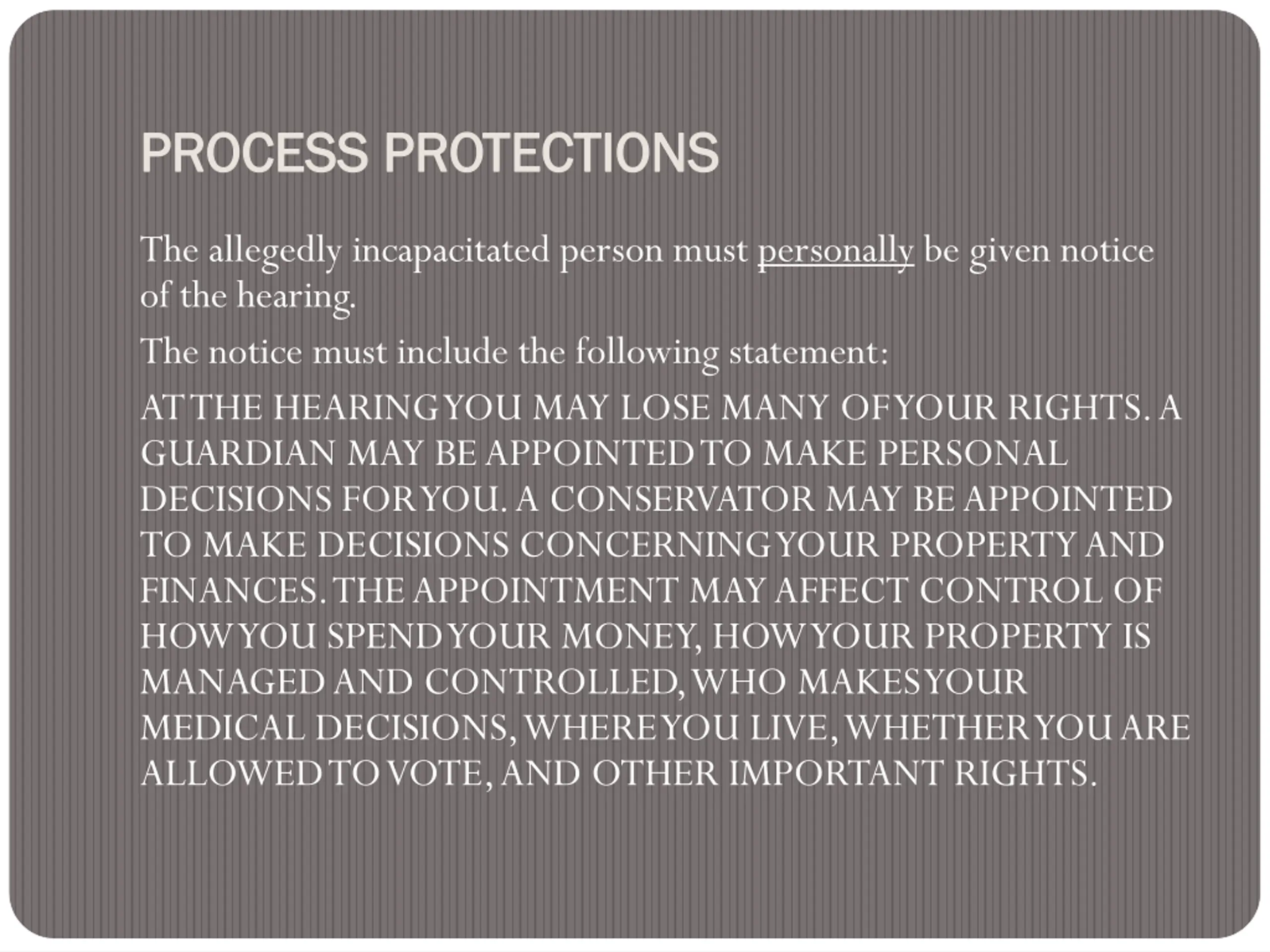 PROCESS PROTECTIONS PROCESS PROTECTIONS The allegedly incapacitated person must personally be given notice of the hearing. The notice must include the following statement: AT THE HEARING YOU MAY LOSE MANY OF YOUR RIGHTS. A GUARDIAN MAY BE APPOINTED TO MAKE PERSONAL DECISIONS FOR YOU. A CONSERVATOR MAY BE APPOINTED TO MAKE DECISIONS CONCERNING YOUR PROPERTY AND FINANCES. THE APPOINTMENT MAY AFFECT CONTROL OF HOW YOU SPEND YOUR MONEY, HOW YOUR PROPERTY IS MANAGED AND CONTROLLED, WHO MAKES YOUR MEDICAL DECISIONS, WHERE YOU LIVE, WHETHER YOU ARE ALLOWED TO VOTE, AND OTHER IMPORTANT RIGHTS.