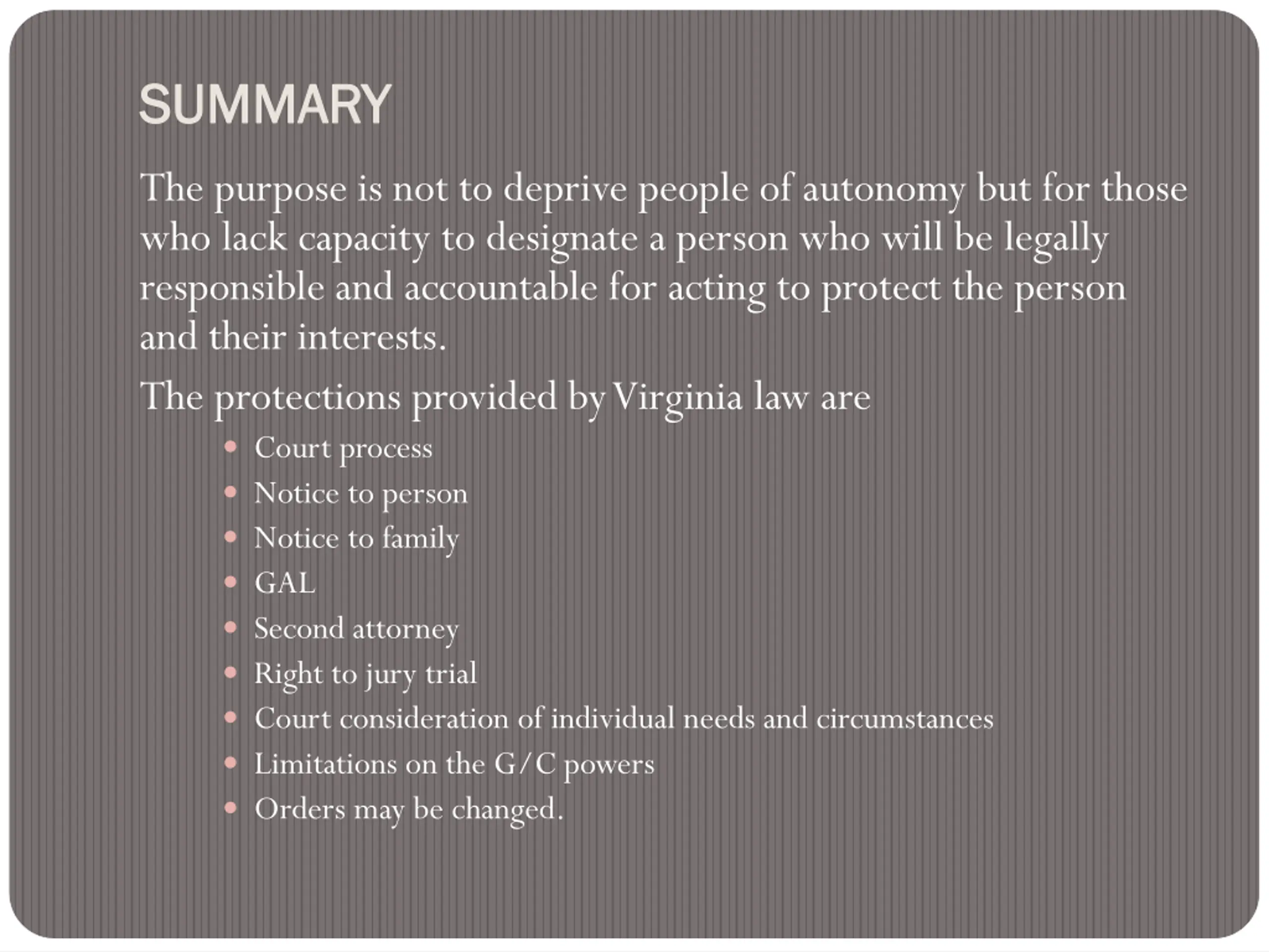 SUMMARY SUMMARY The purpose is not to deprive people of autonomy but for those who lack capacity to designate a person who will be legally responsible and accountable for acting to protect the person and their interests. The protections provided by Virginia law are Court process Notice to person Notice to family GAL Second attorney Right to jury trial Court consideration of individual needs and circumstances Limitations on the G/C powers Orders may be changed.