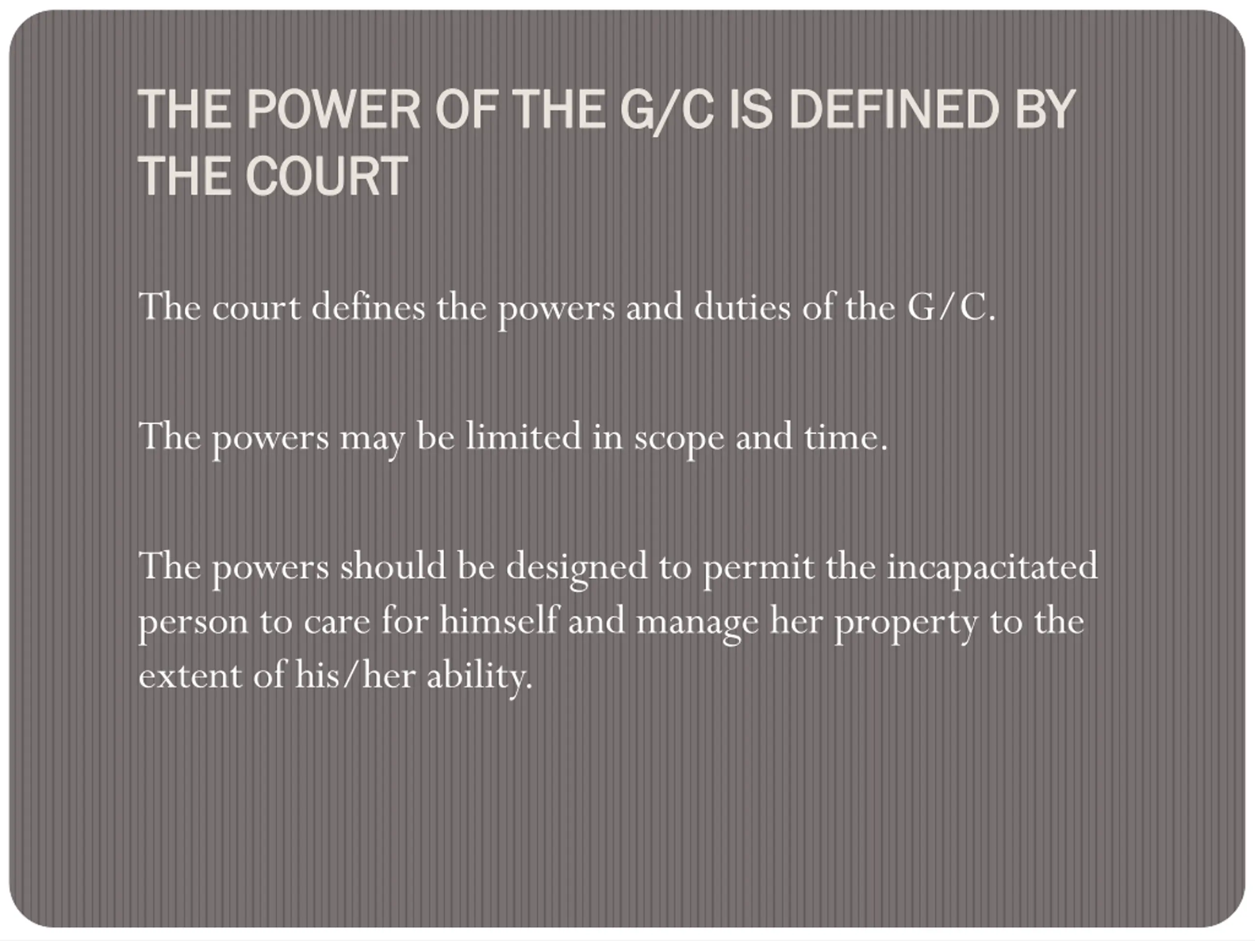 THE POWER OF THE G/C THE POWER OF THE G/C IS THE THE COURT COURT IS DEFINED BY DEFINED BY The court defines the powers and duties of the G/C. The powers may be limited in scope and time. The powers should be designed to permit the incapacitated person to care for himself and manage her property to the extent of his/her ability.