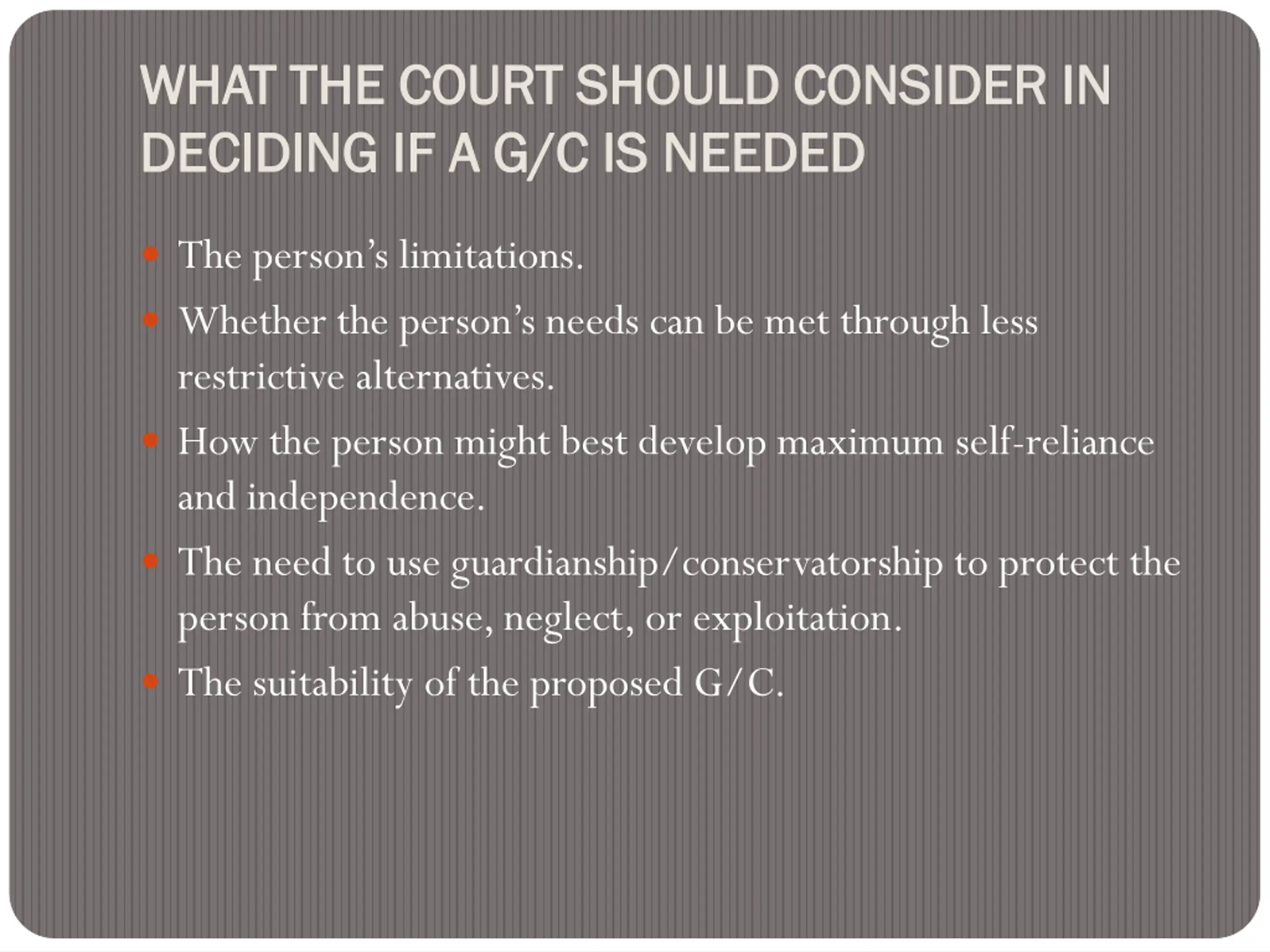 WHAT THE COURT SHOULD CONSIDER IN WHAT THE COURT SHOULD CONSIDER IN DECIDING IF A G/C IS NEEDED DECIDING IF A G/C IS NEEDED The person s limitations. Whether the person s needs can be met through less restrictive alternatives. How the person might best develop maximum self-reliance and independence. The need to use guardianship/conservatorship to protect the person from abuse, neglect, or exploitation. The suitability of the proposed G/C.