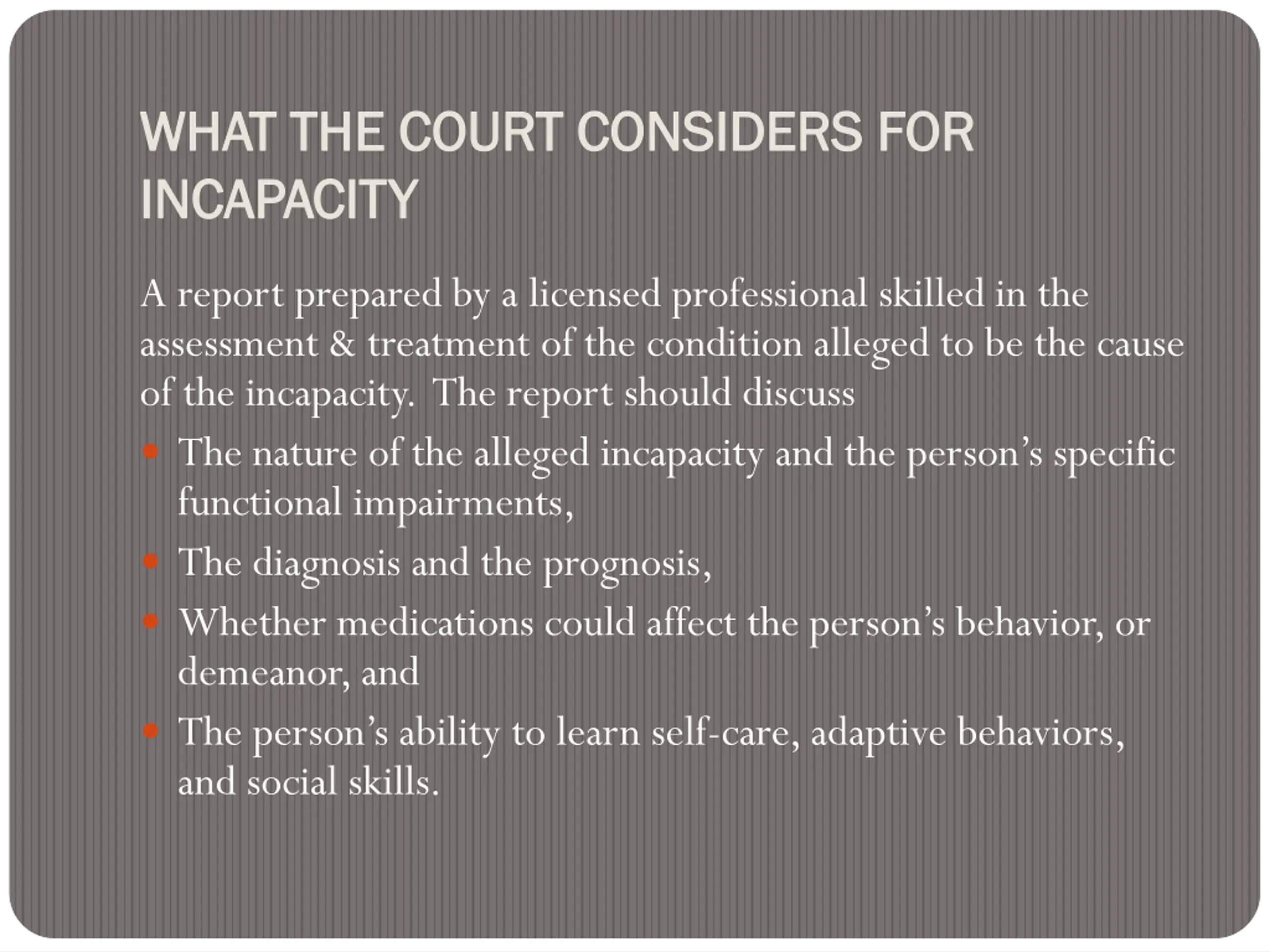 WHAT WHAT THE COURT THE COURT CONSIDERS INCAPACITY INCAPACITY CONSIDERS FOR FOR A report prepared by a licensed professional skilled in the assessment & treatment of the condition alleged to be the cause of the incapacity. The report should discuss The nature of the alleged incapacity and the person s specific functional impairments, The diagnosis and the prognosis, Whether medications could affect the person s behavior, or demeanor, and The person s ability to learn self-care, adaptive behaviors, and social skills.