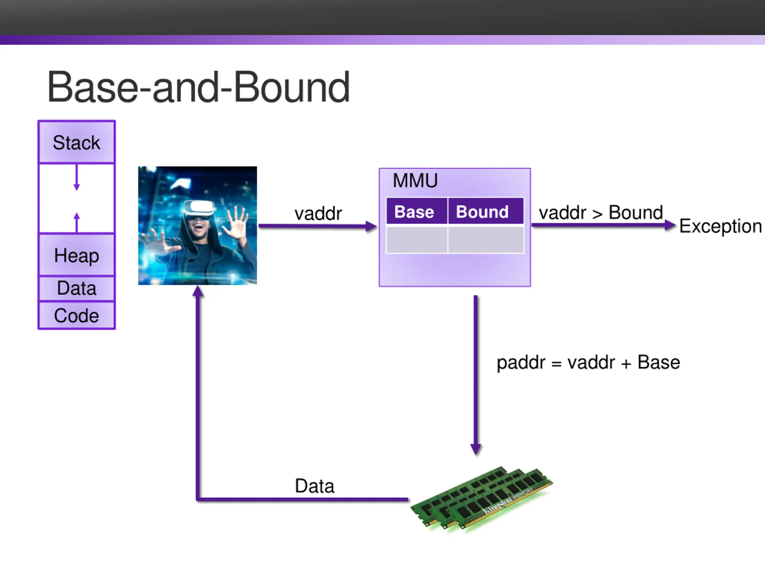 Base-and-Bound Stack MMU vaddr > Bound vaddr Base Bound Exception Heap Data Code paddr = vaddr + Base Data