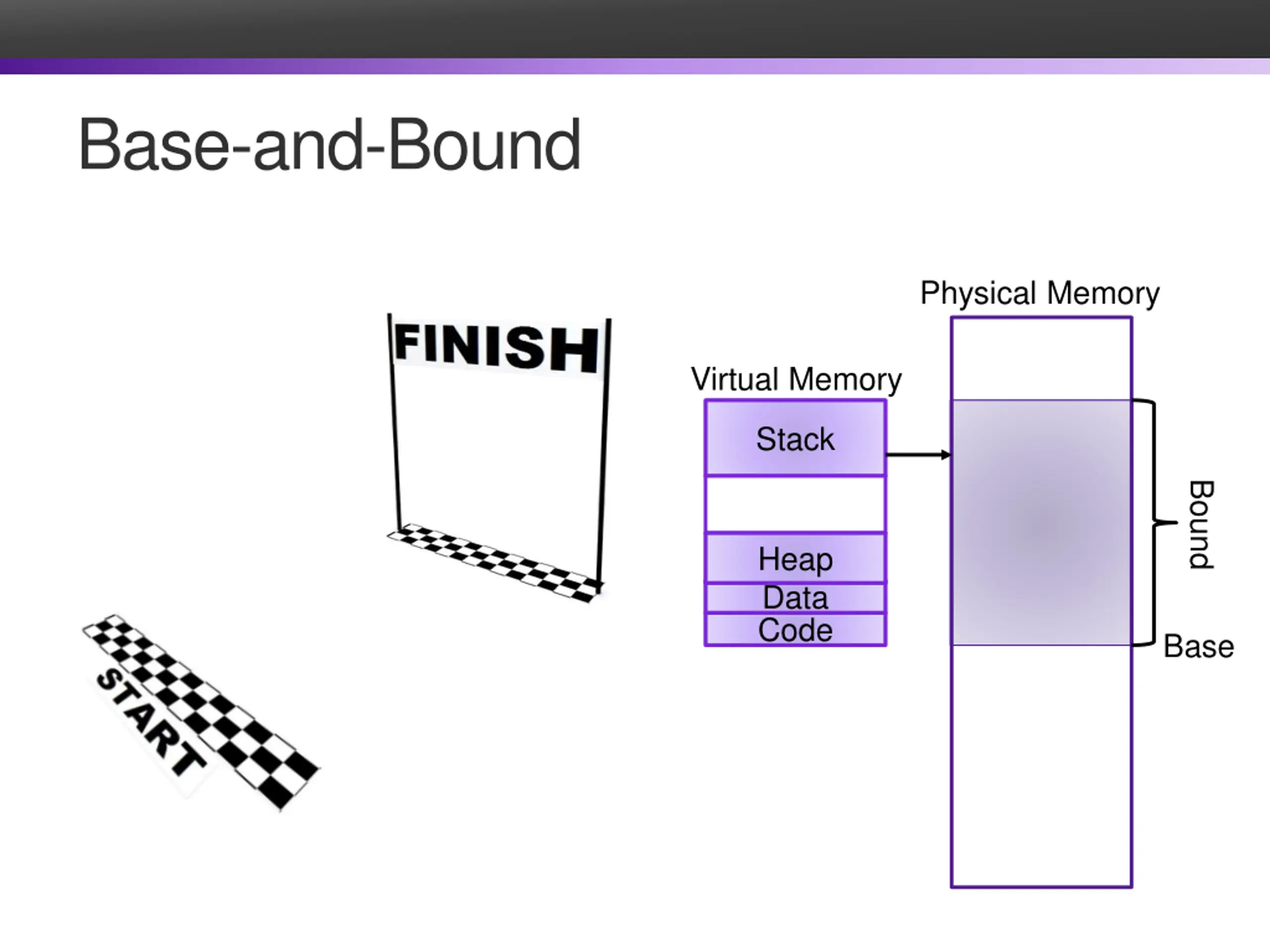 Base-and-Bound Physical Memory Virtual Memory Stack Bound Heap Data Code Base