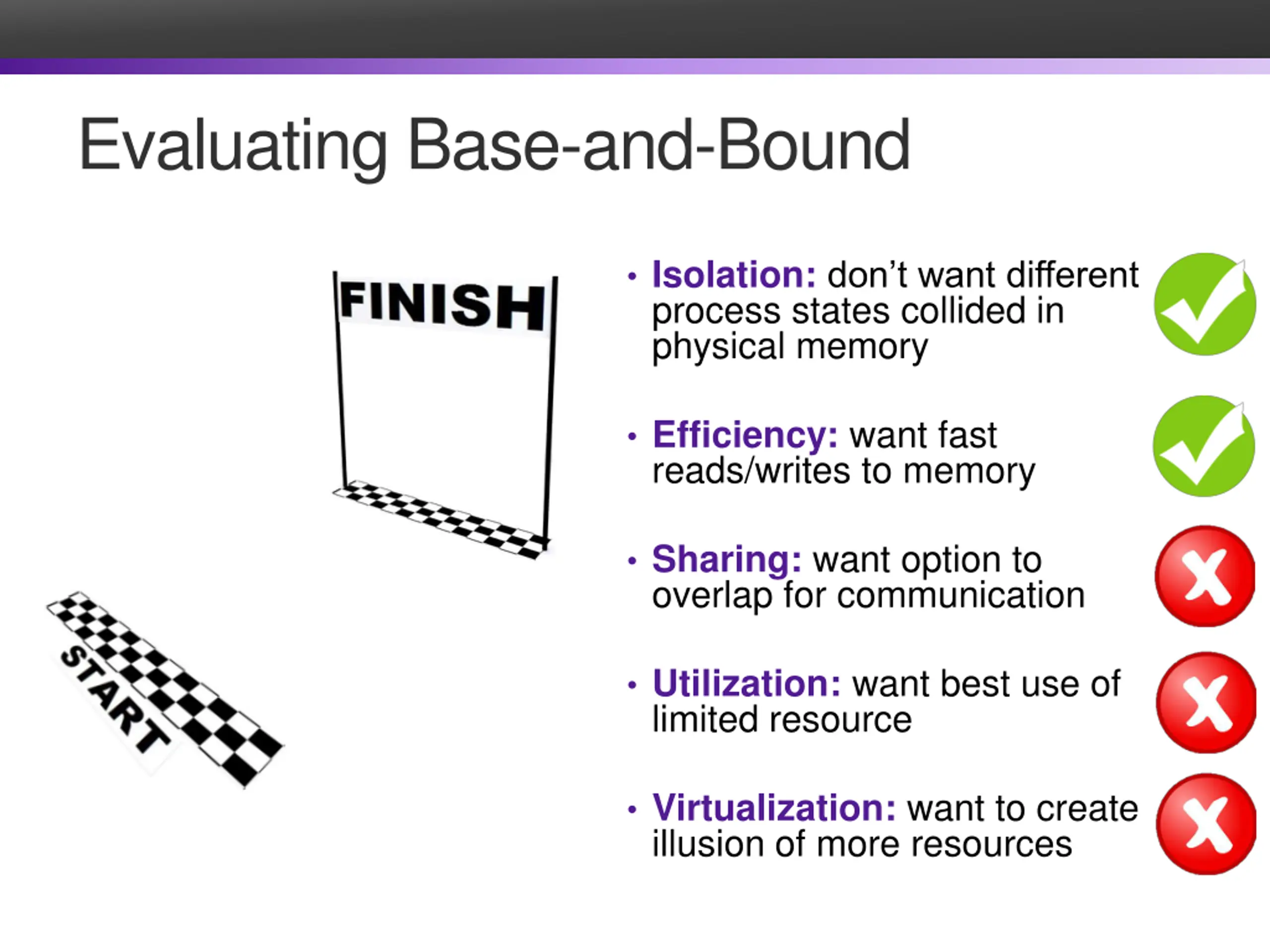 Evaluating Base-and-Bound Isolation: don t want different process states collided in physical memory Efficiency: want fast reads/writes to memory Sharing: want option to overlap for communication Utilization: want best use of limited resource Virtualization: want to create illusion of more resources