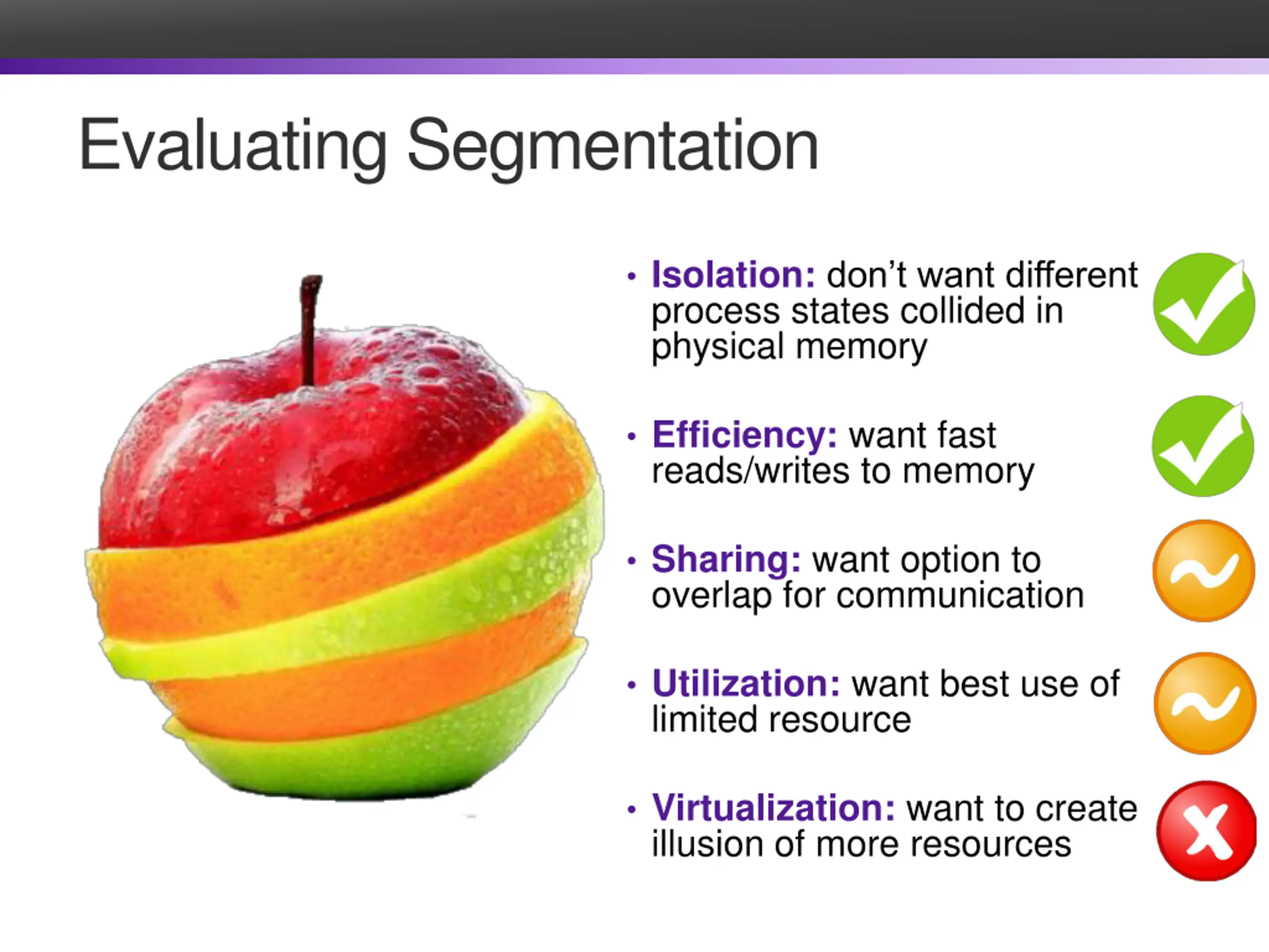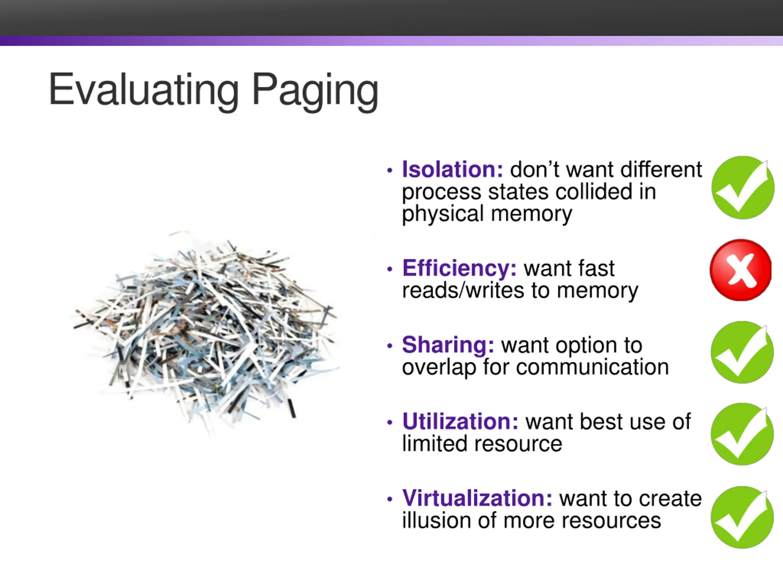 Evaluating Segmentation Isolation: don t want different process states collided in physical memory Efficiency: want fast reads/writes to memory Sharing: want option to overlap for communication Utilization: want best use of limited resource Virtualization: want to create illusion of more resources