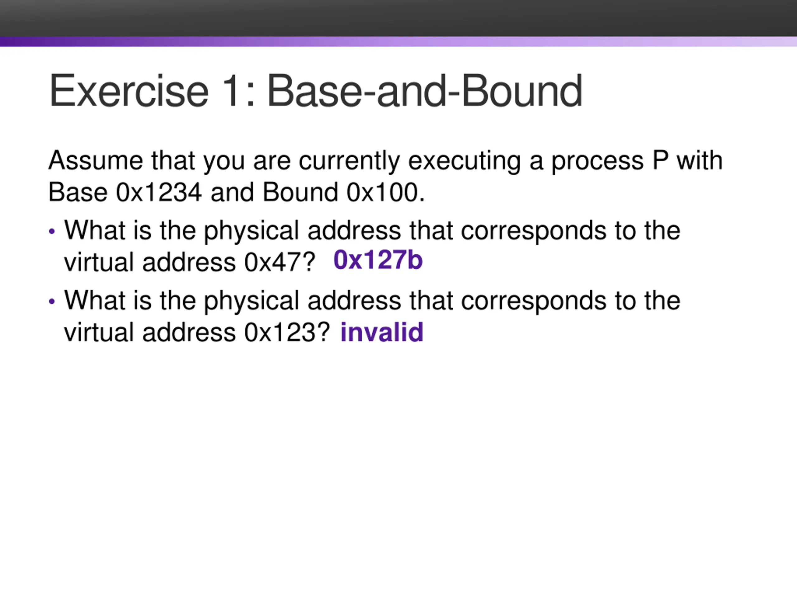 Exercise 1: Base-and-Bound Assume that you are currently executing a process P with Base 0x1234 and Bound 0x100. What is the physical address that corresponds to the virtual address 0x47? What is the physical address that corresponds to the virtual address 0x123? invalid 0x127b