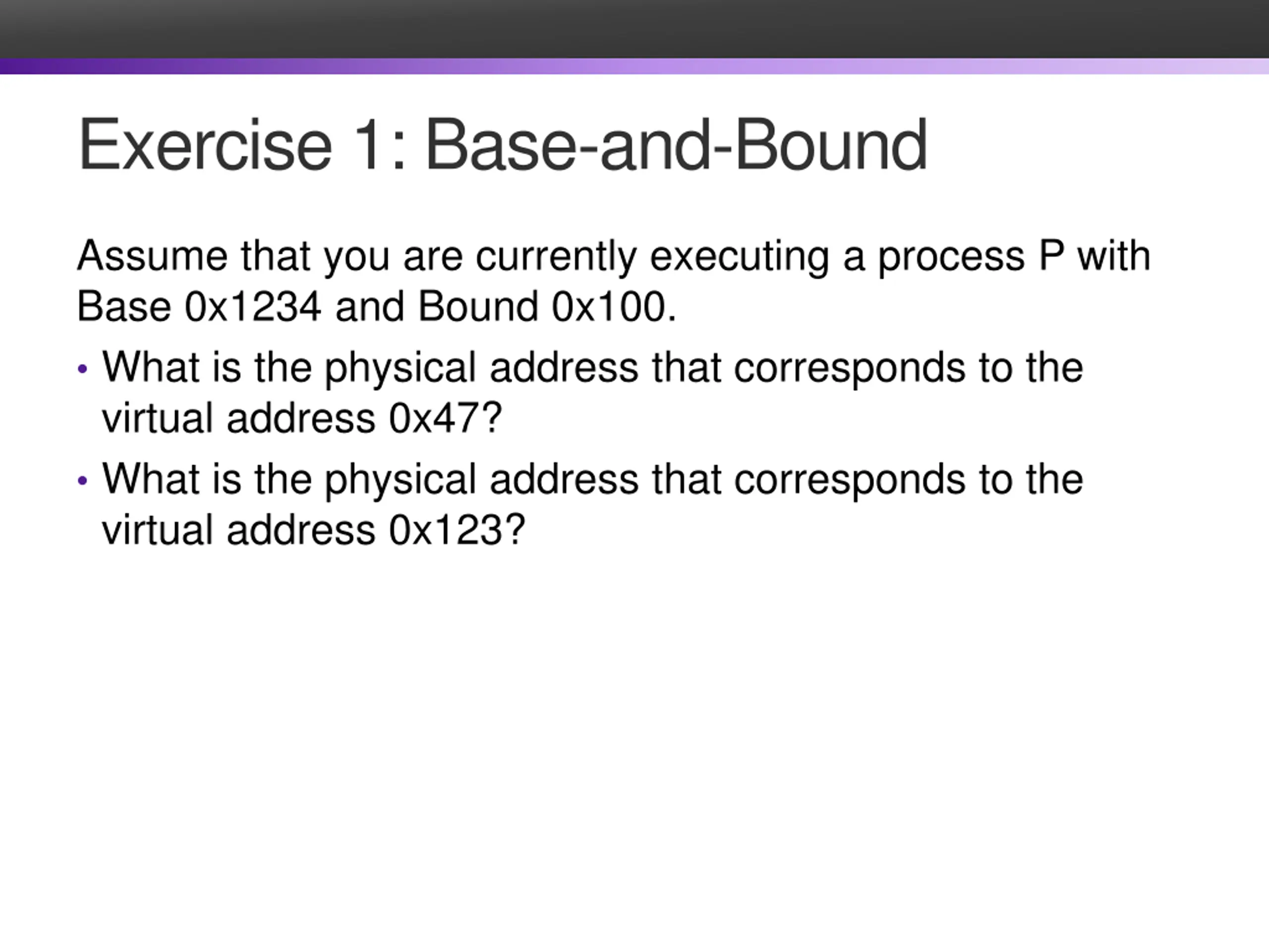 Exercise 1: Base-and-Bound Assume that you are currently executing a process P with Base 0x1234 and Bound 0x100. What is the physical address that corresponds to the virtual address 0x47? What is the physical address that corresponds to the virtual address 0x123?