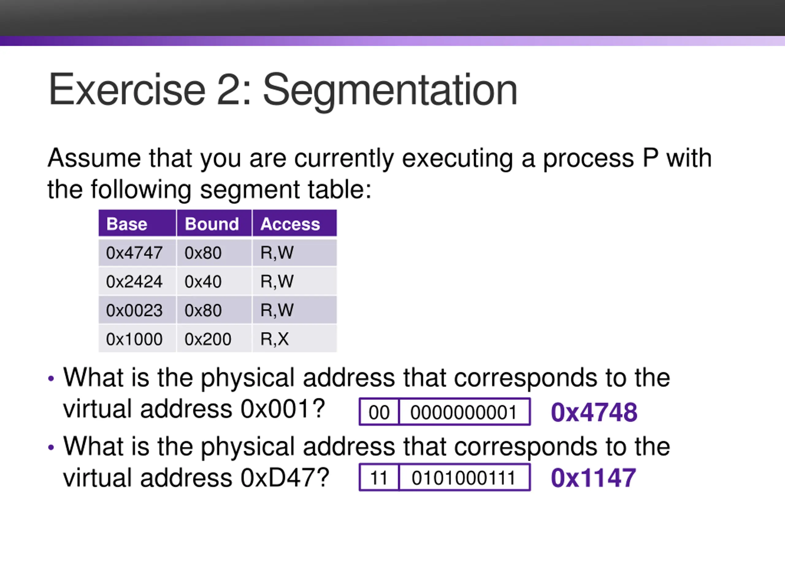 Exercise 2: Segmentation Assume that you are currently executing a process P with the following segment table: Base 0x4747 0x2424 0x0023 0x1000 Bound 0x80 0x40 0x80 0x200 Access R,W R,W R,W R,X What is the physical address that corresponds to the virtual address 0x001? What is the physical address that corresponds to the virtual address 0xD47? 0x4748 00 0000000001 0x1147 11 0101000111