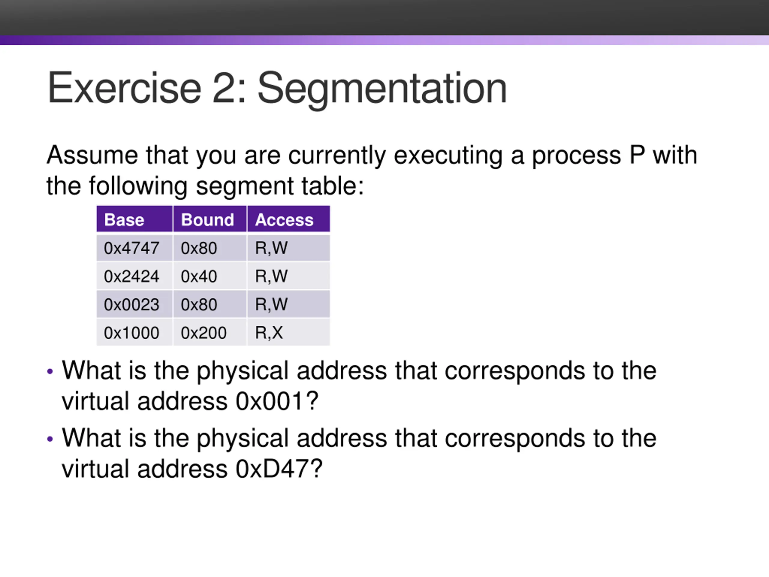 Exercise 2: Segmentation Assume that you are currently executing a process P with the following segment table: Base 0x4747 0x2424 0x0023 0x1000 Bound 0x80 0x40 0x80 0x200 Access R,W R,W R,W R,X What is the physical address that corresponds to the virtual address 0x001? What is the physical address that corresponds to the virtual address 0xD47?