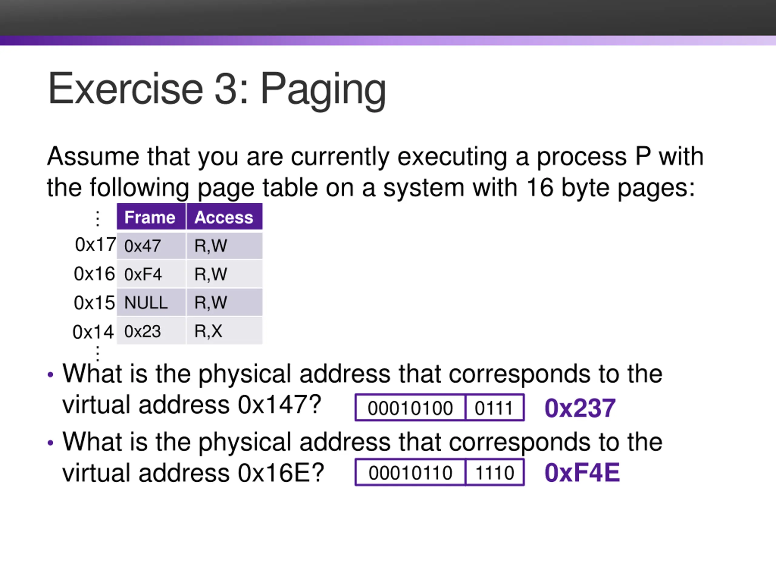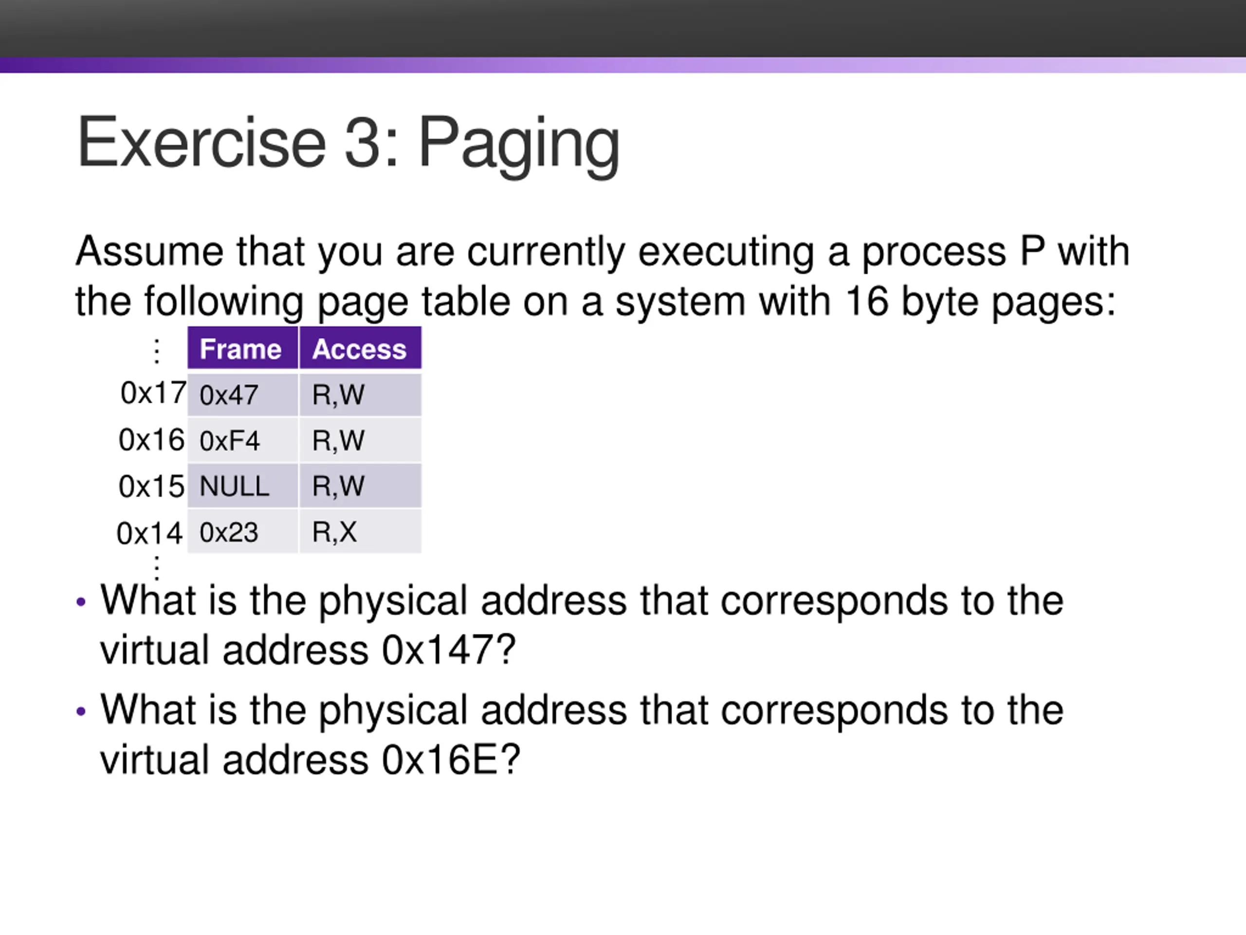 Exercise 3: Paging Assume that you are currently executing a process P with the following page table on a system with 16 byte pages: Frame Access 0x47 R,W 0xF4 R,W NULL R,W 0x23 R,X 0x14 0x17 0x16 0x15 What is the physical address that corresponds to the virtual address 0x147? What is the physical address that corresponds to the virtual address 0x16E?