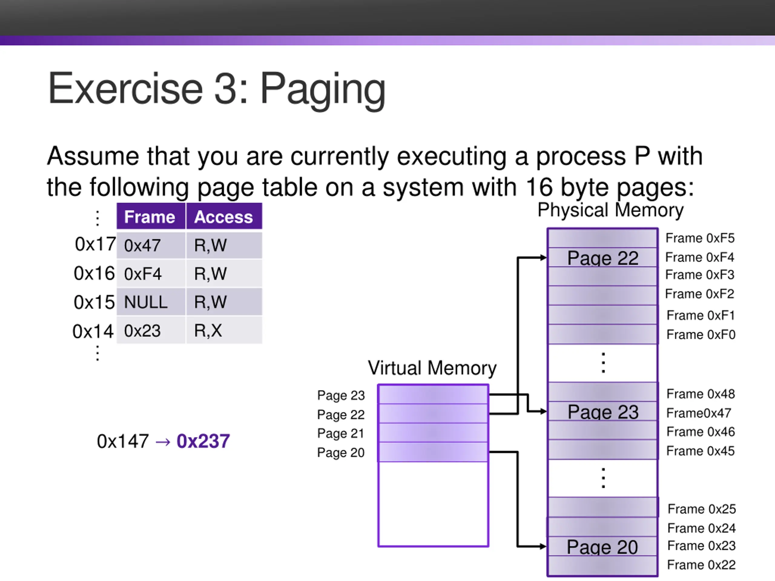Exercise 3: Paging Assume that you are currently executing a process P with the following page table on a system with 16 byte pages: Frame Access 0x47 R,W 0xF4 R,W NULL R,W 0x23 R,X Virtual Memory Physical Memory 0x17 0x16 Frame 0xF5 Page 22 Frame 0xF4 Frame 0xF3 Frame 0xF2 0x15 0x14 Frame 0xF1 Frame 0xF0 Frame 0x48 Page 23 Page 23 Frame0x47 Page 22 Frame 0x46 Page 21 0x147 0x237 Frame 0x45 Page 20 Frame 0x25 Frame 0x24 Page 20 Frame 0x23 Frame 0x22