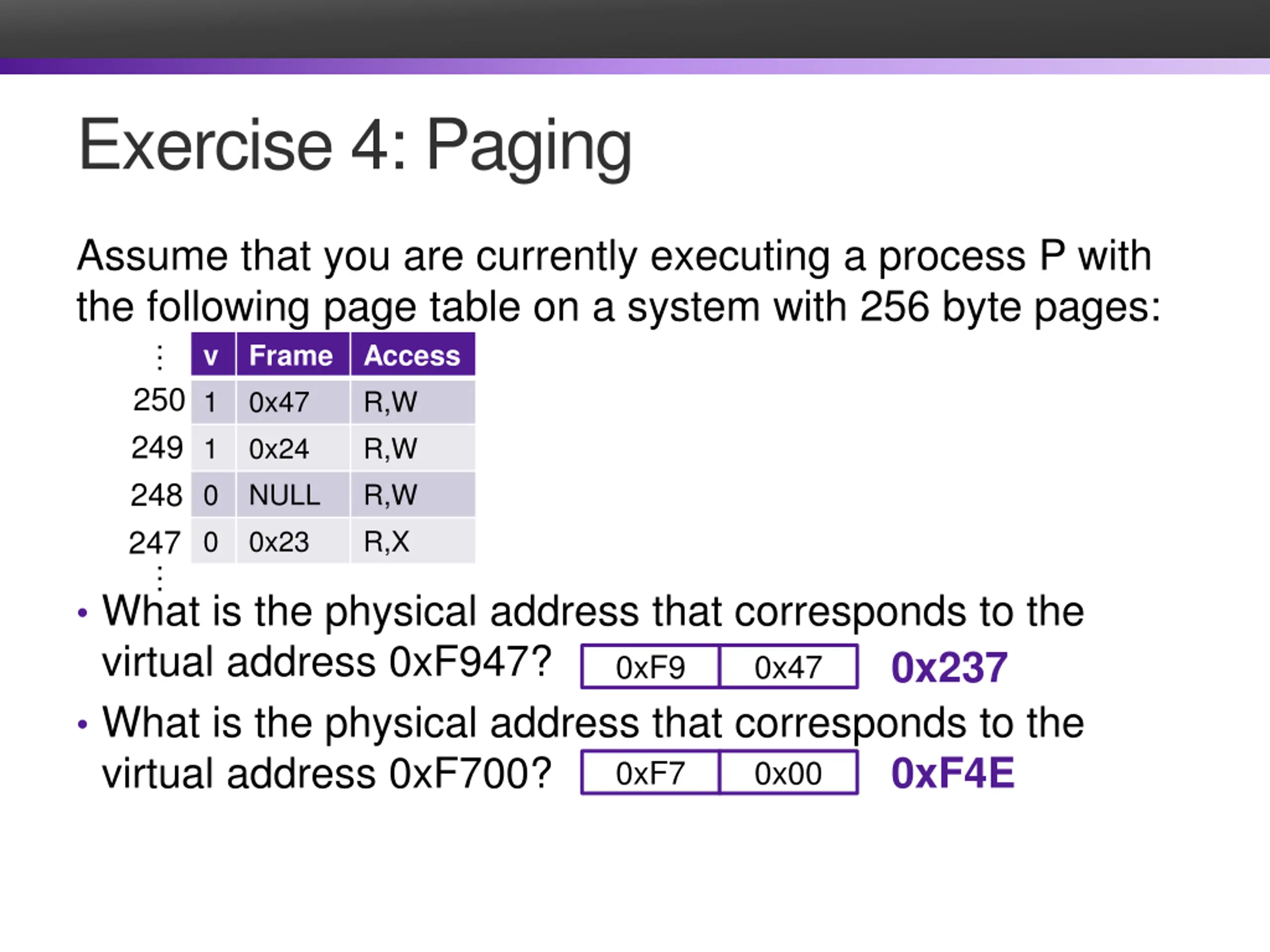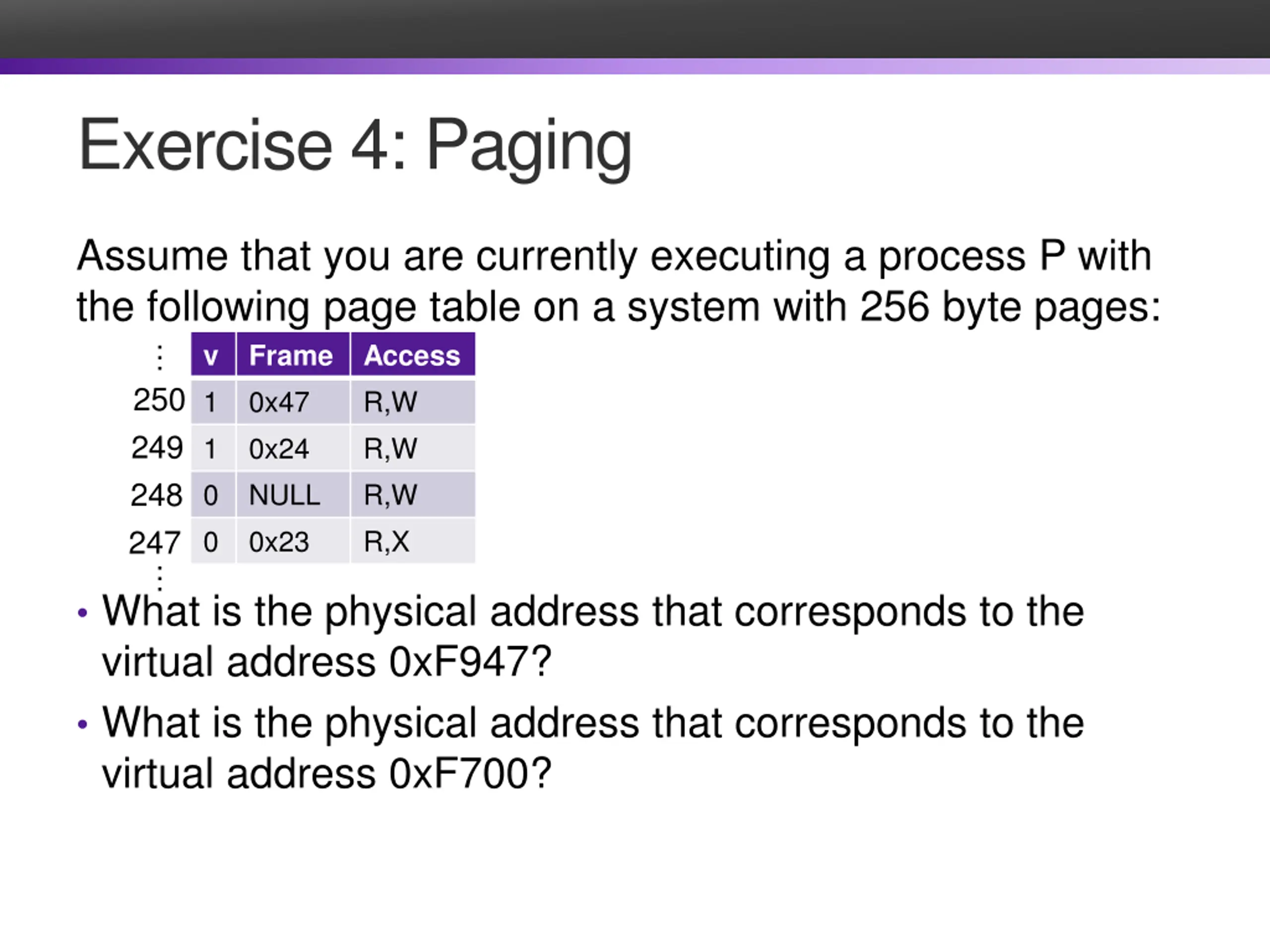 Exercise 4: Paging Assume that you are currently executing a process P with the following page table on a system with 256 byte pages: v Frame Access 1 0x47 R,W 1 0x24 R,W 0 NULL R,W 0 0x23 R,X 247 250 249 248 What is the physical address that corresponds to the virtual address 0xF947? What is the physical address that corresponds to the virtual address 0xF700?