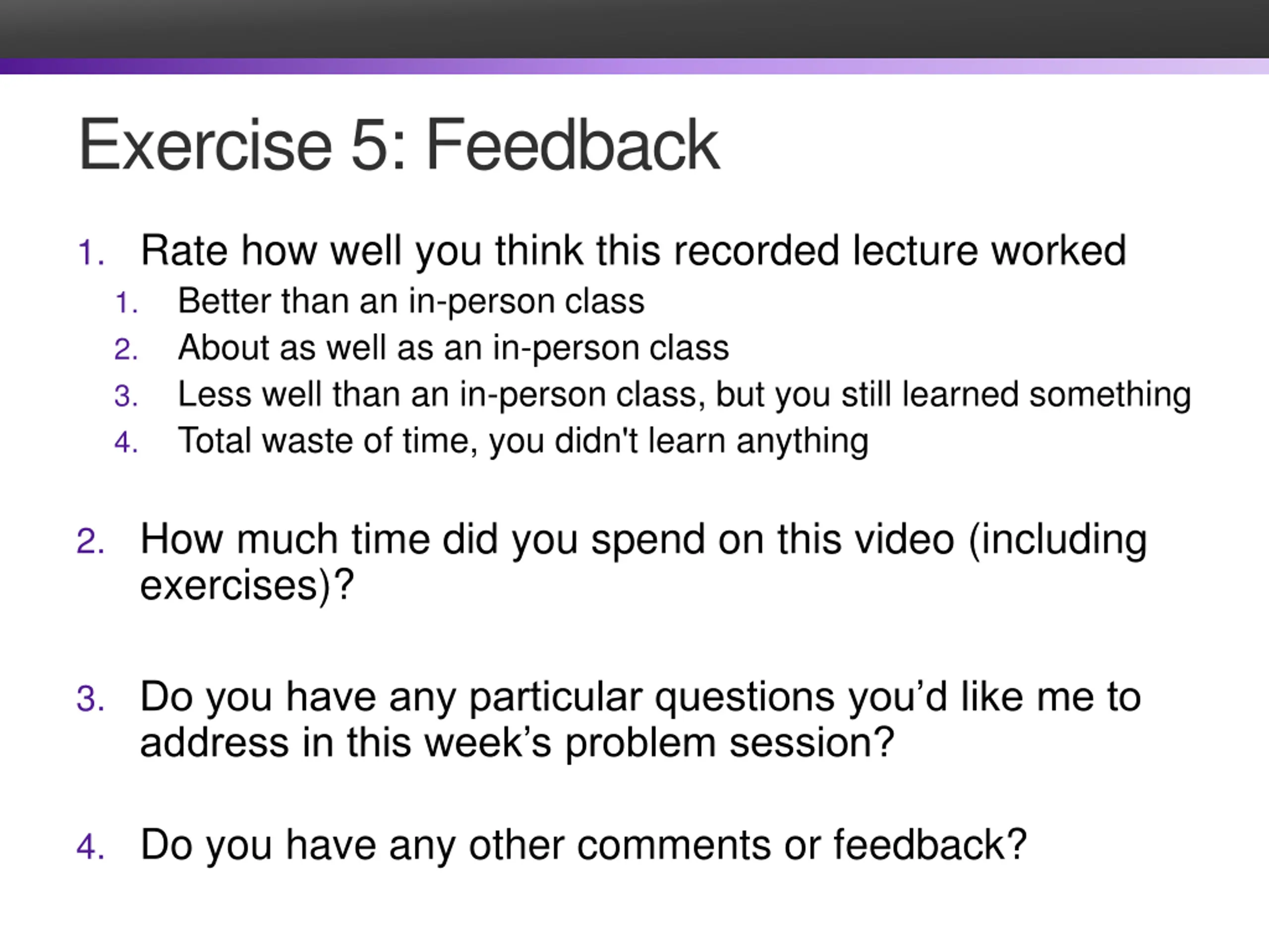 Exercise 5: Feedback 1. Rate how well you think this recorded lecture worked 1. Better than an in-person class 2. About as well as an in-person class 3. Less well than an in-person class, but you still learned something 4. Total waste of time, you didn't learn anything 2. How much time did you spend on this video (including exercises)? 3. Do you have any particular questions you d like me to address in this week s problem session? 4. Do you have any other comments or feedback?