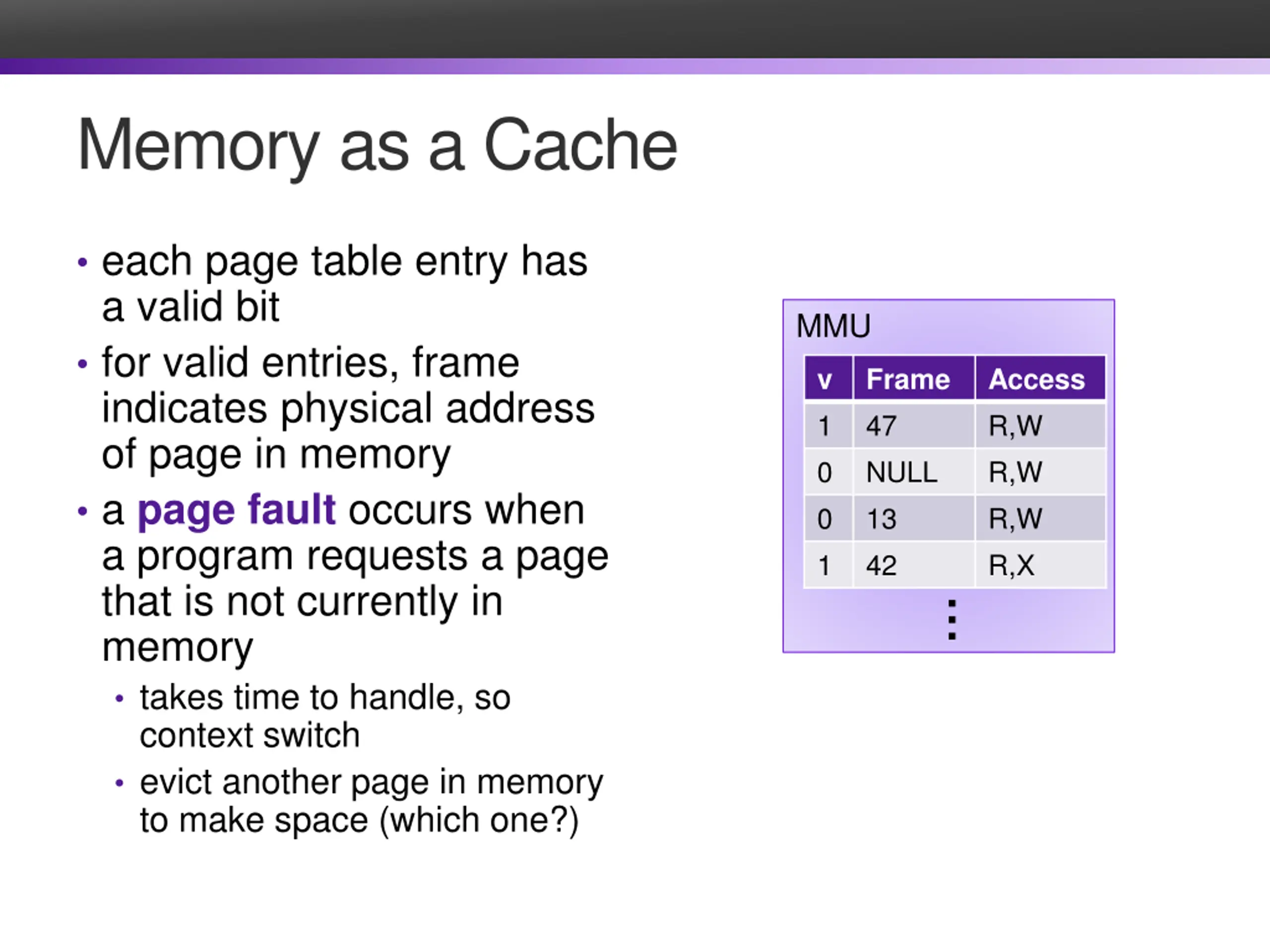 Memory as a Cache each page table entry has a valid bit for valid entries, frame indicates physical address of page in memory a page fault occurs when a program requests a page that is not currently in memory takes time to handle, so context switch evict another page in memory to make space (which one?) MMU v 1 0 0 1 Frame 47 NULL 13 42 Access R,W R,W R,W R,X