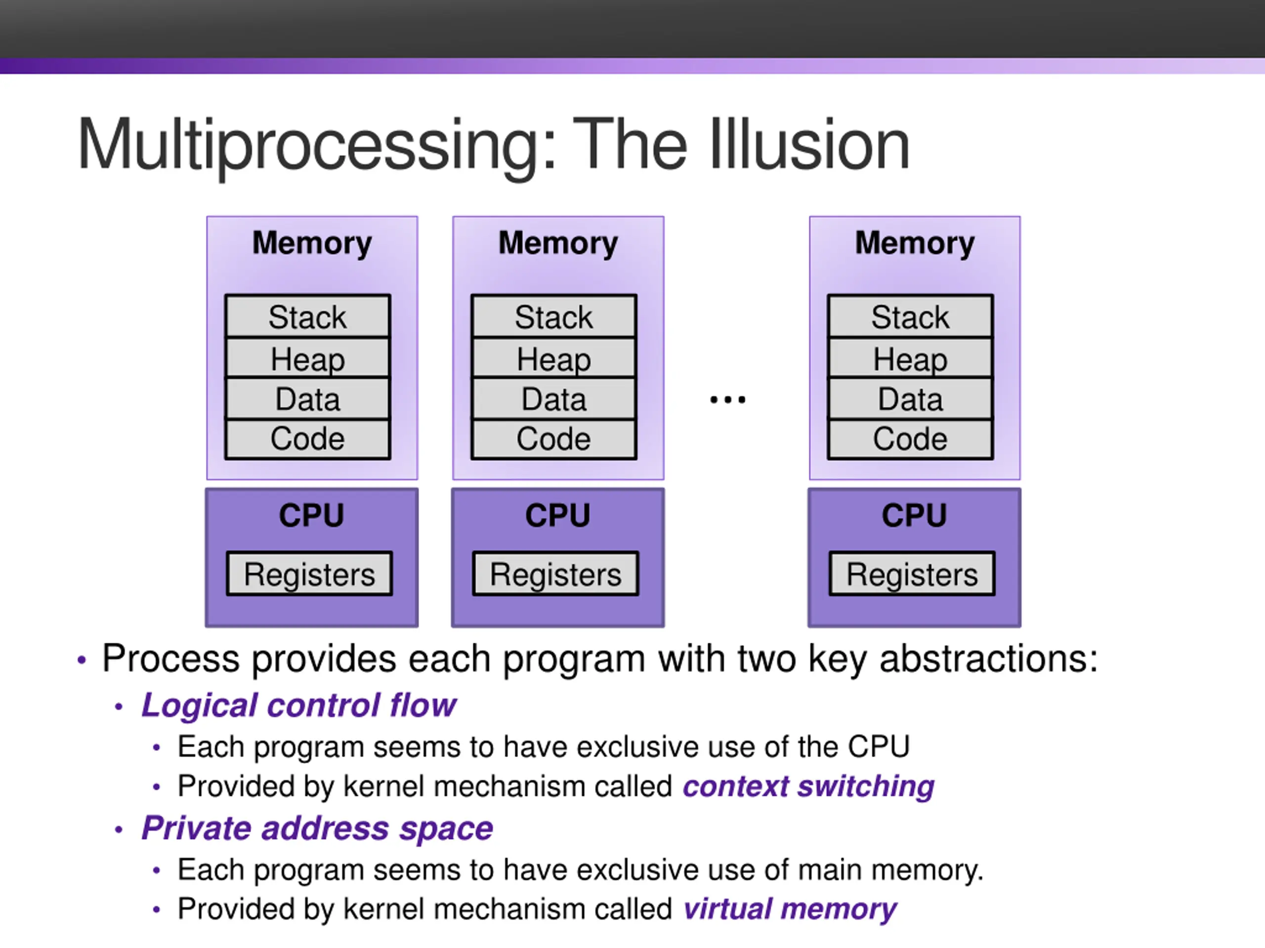 Multiprocessing: The Illusion Memory Memory Memory Stack Heap Data Stack Heap Data Stack Heap Data Code Code Code CPU CPU CPU Registers Registers Registers Process provides each program with two key abstractions: Logical control flow Each program seems to have exclusive use of the CPU Provided by kernel mechanism called context switching Private address space Each program seems to have exclusive use of main memory. Provided by kernel mechanism called virtual memory