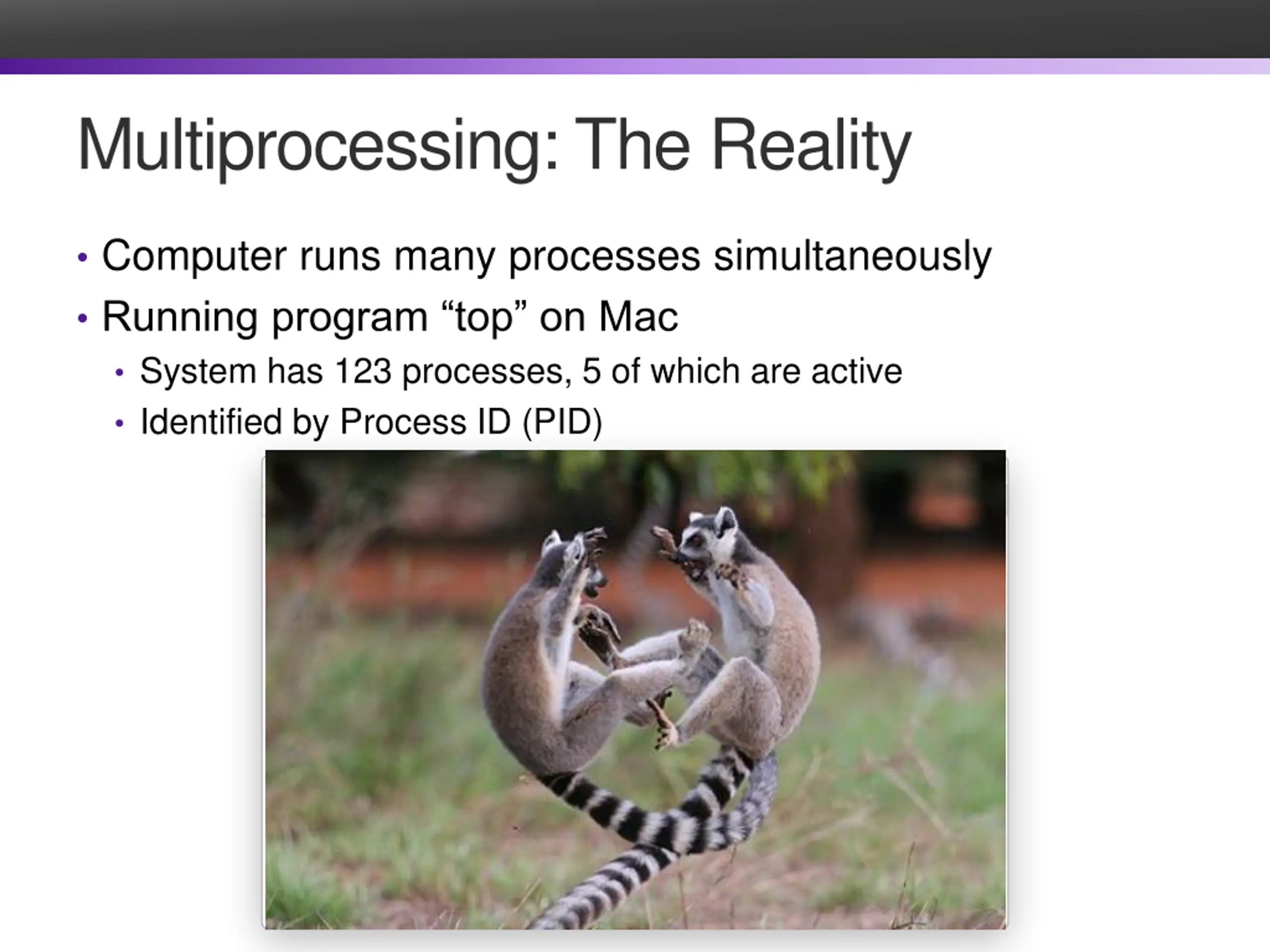 Multiprocessing: The Reality Computer runs many processes simultaneously Running program top on Mac System has 123 processes, 5 of which are active Identified by Process ID (PID)