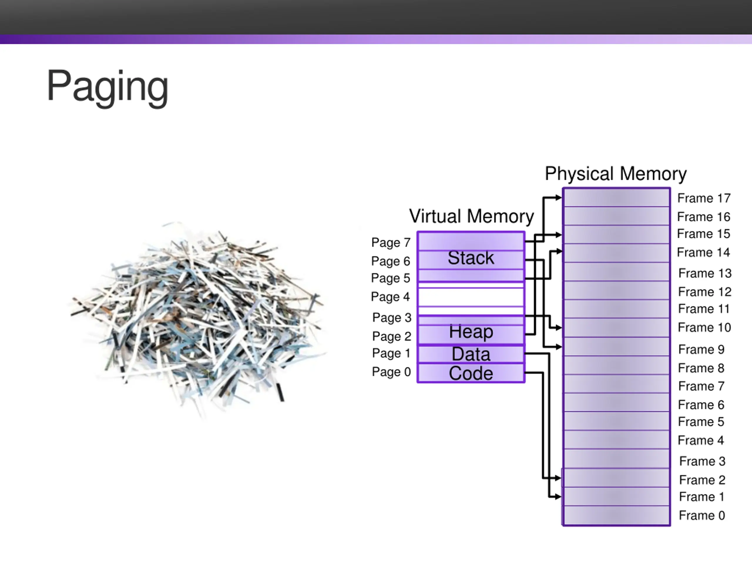 Paging Physical Memory Frame 17 Virtual Memory Frame 16 Frame 15 Page 7 Frame 14 Stack Page 6 Frame 13 Page 5 Frame 12 Page 4 Frame 11 Page 3 Heap Frame 10 Page 2 Frame 9 Data Page 1 Frame 8 Code Page 0 Frame 7 Frame 6 Frame 5 Frame 4 Frame 3 Frame 2 Frame 1 Frame 0
