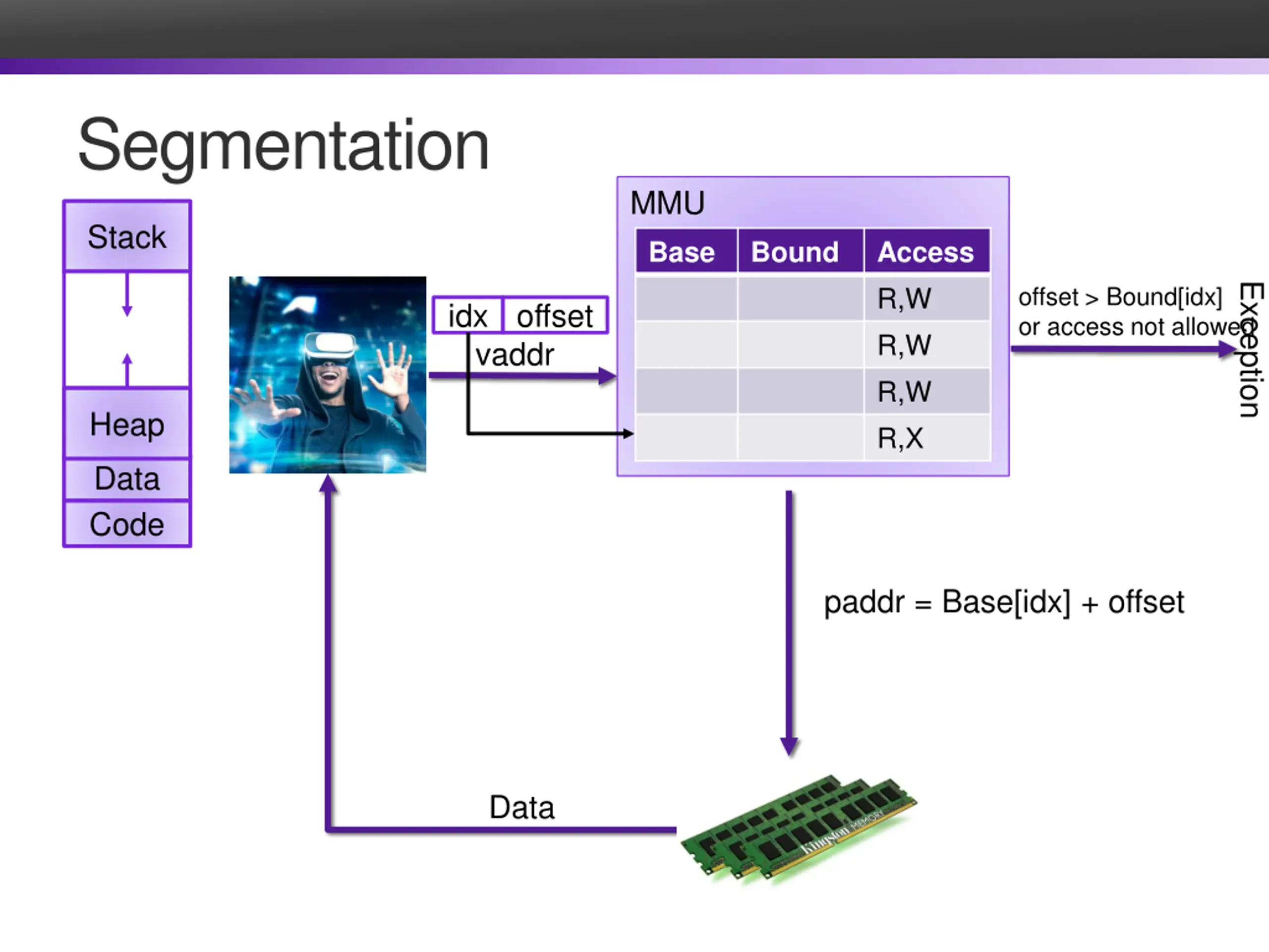 Segmentation MMU Stack Base Bound Access R,W R,W R,W R,X Exception offset > Bound[idx] or access not allowed idx offset vaddr Heap Data Code paddr = Base[idx] + offset Data