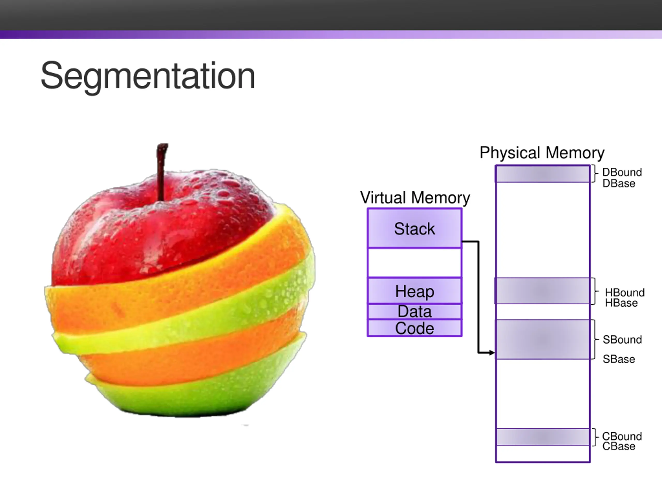 Segmentation Physical Memory DBound DBase Virtual Memory Stack Heap HBound HBase Data Code SBound SBase CBound CBase