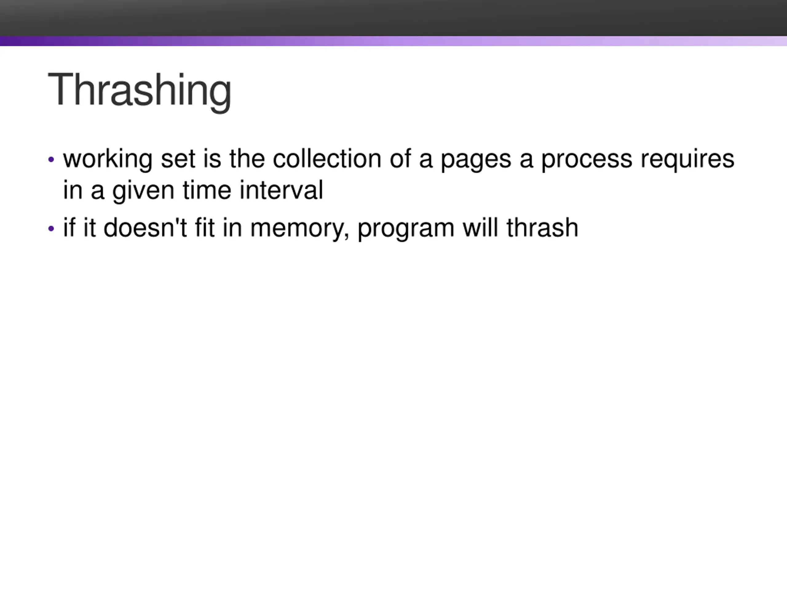 Thrashing working set is the collection of a pages a process requires in a given time interval if it doesn't fit in memory, program will thrash