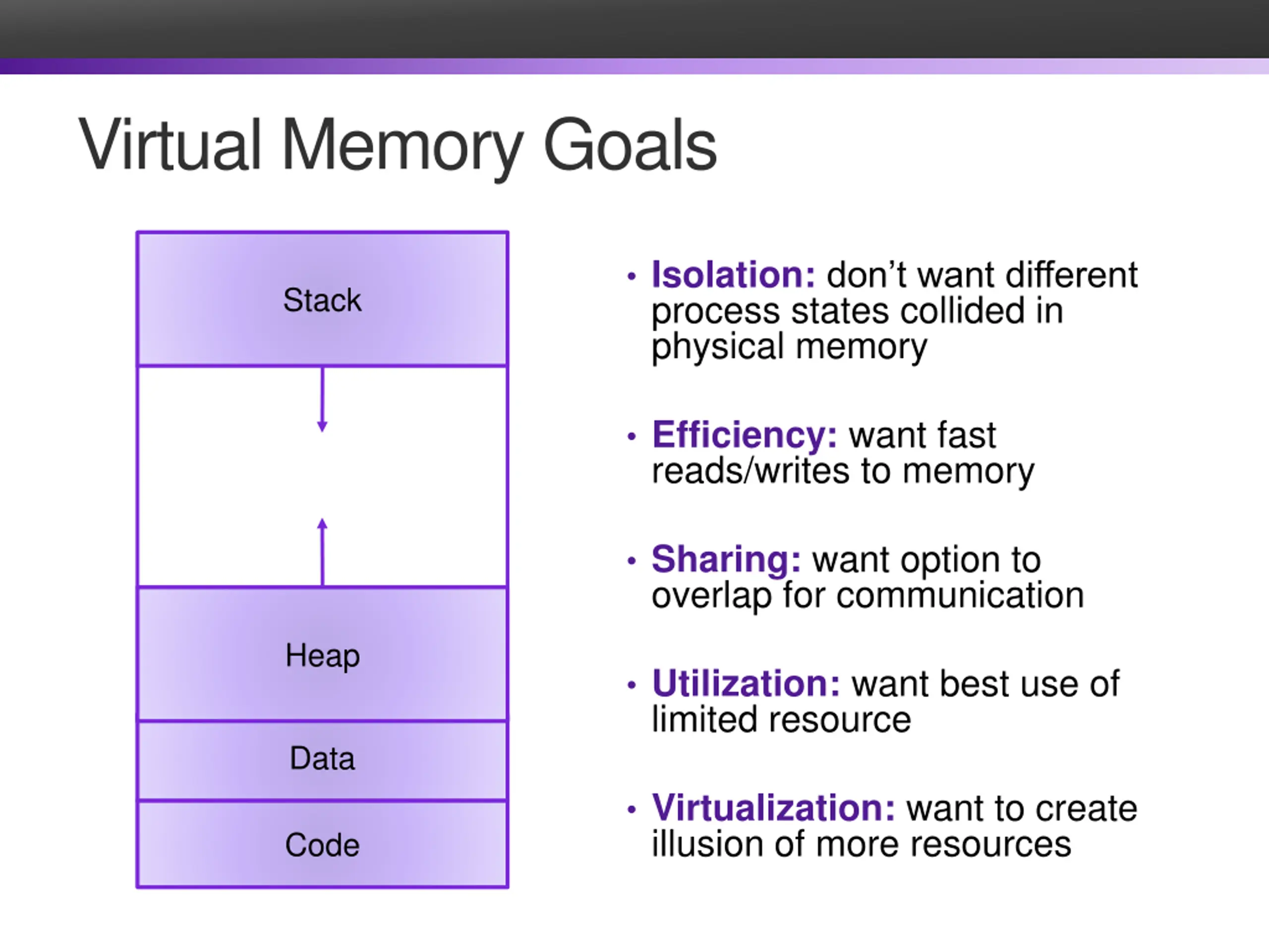 Virtual Memory Goals Isolation: don t want different process states collided in physical memory Efficiency: want fast reads/writes to memory Stack Sharing: want option to overlap for communication Heap Utilization: want best use of limited resource Data Virtualization: want to create illusion of more resources Code