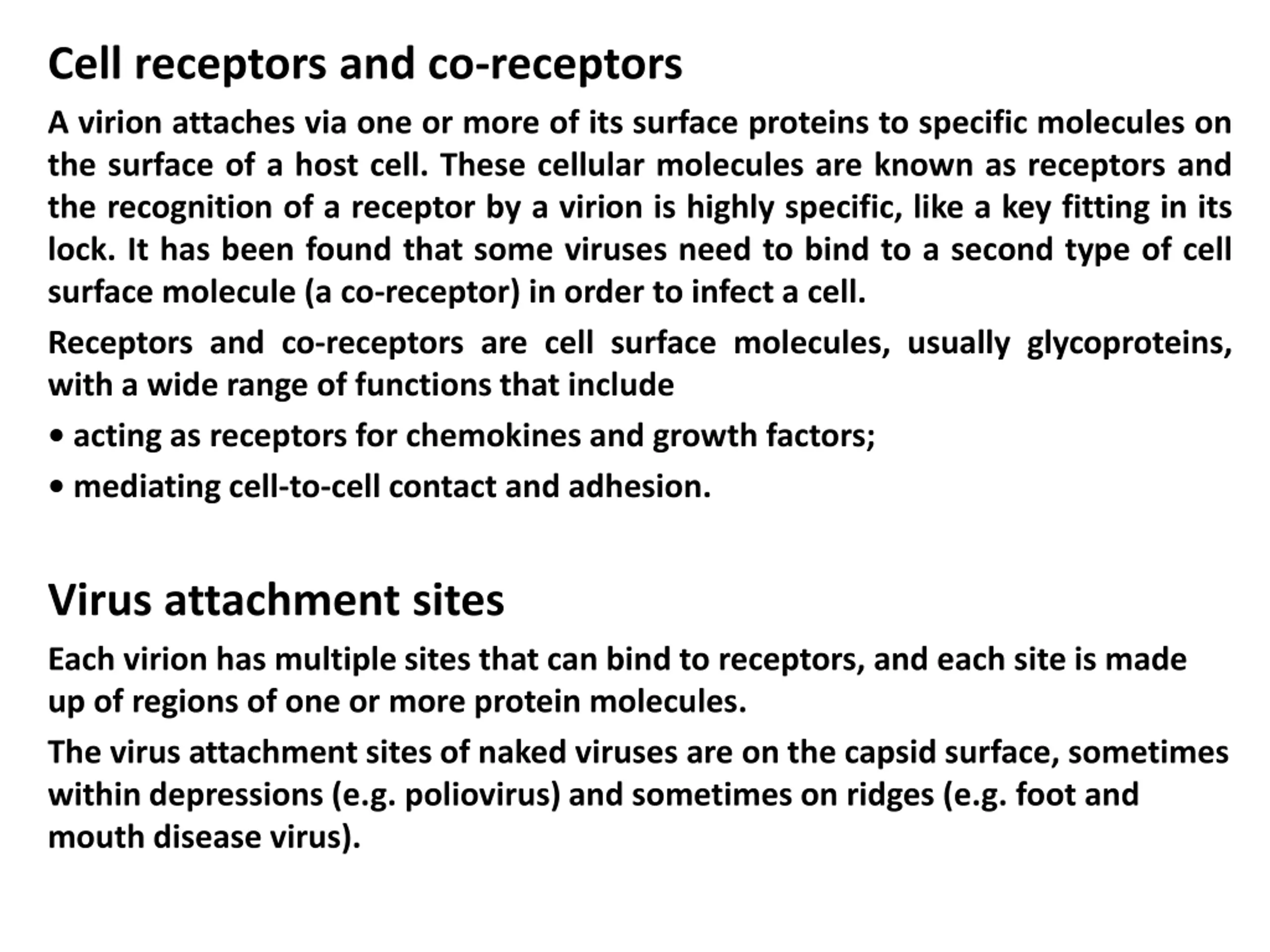 Cell receptors and co-receptors A virion attaches via one or more of its surface proteins to specific molecules on the surface of a host cell. These cellular molecules are known as receptors and the recognition of a receptor by a virion is highly specific, like a key fitting in its lock. It has been found that some viruses need to bind to a second type of cell surface molecule (a co-receptor) in order to infect a cell. Receptors and co-receptors are cell surface molecules, usually glycoproteins, with a wide range of functions that include acting as receptors for chemokines and growth factors; mediating cell-to-cell contact and adhesion. Virus attachment sites Each virion has multiple sites that can bind to receptors, and each site is made up of regions of one or more protein molecules. The virus attachment sites of naked viruses are on the capsid surface, sometimes within depressions (e.g. poliovirus) and sometimes on ridges (e.g. foot and mouth disease virus).