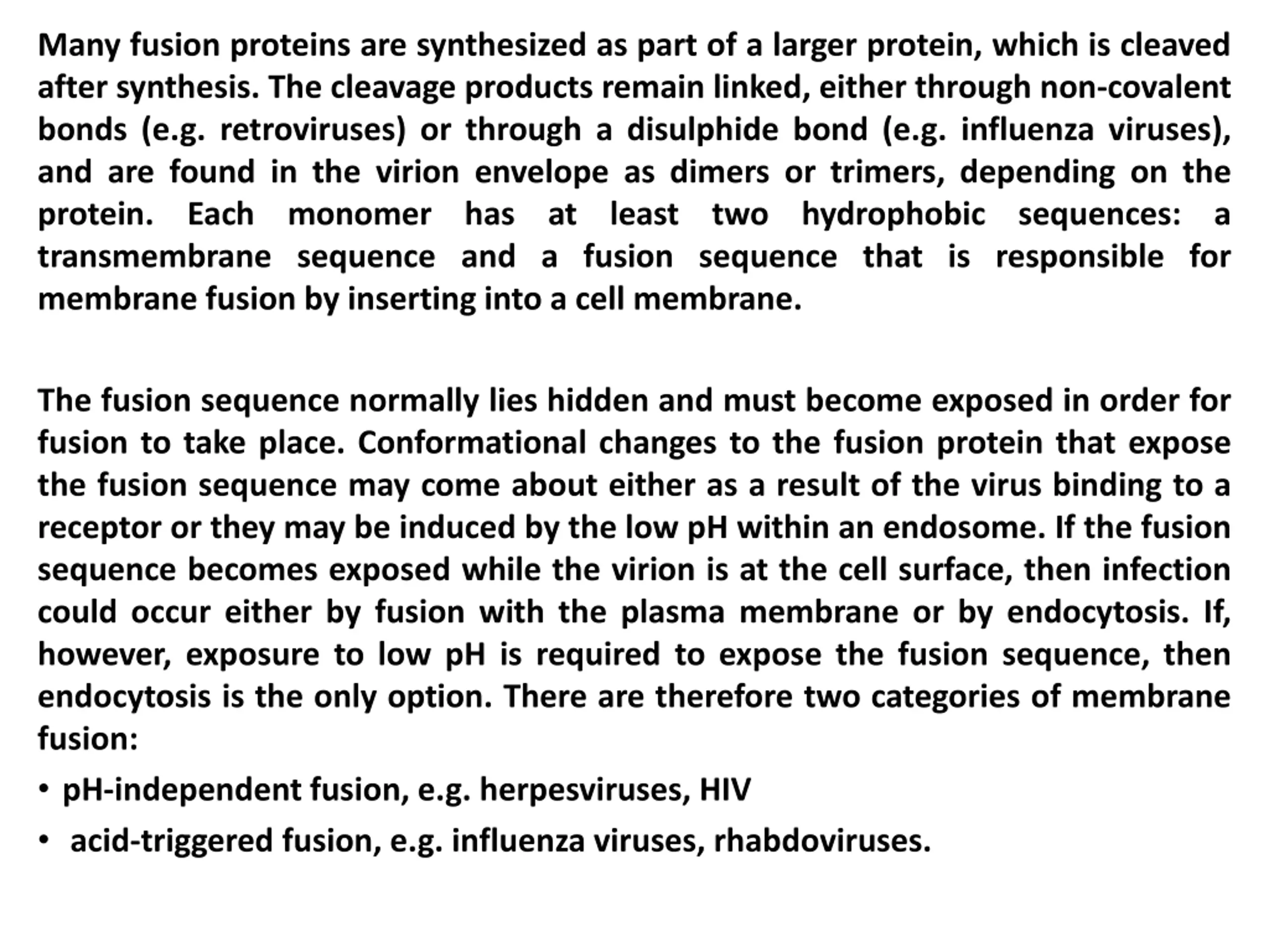 Many fusion proteins are synthesized as part of a larger protein, which is cleaved after synthesis. The cleavage products remain linked, either through non-covalent bonds (e.g. retroviruses) or through a disulphide bond (e.g. influenza viruses), and are found in the virion envelope as dimers or trimers, depending on the protein. Each monomer has at least transmembrane sequence and a fusion sequence that is responsible for membrane fusion by inserting into a cell membrane. two hydrophobic sequences: a The fusion sequence normally lies hidden and must become exposed in order for fusion to take place. Conformational changes to the fusion protein that expose the fusion sequence may come about either as a result of the virus binding to a receptor or they may be induced by the low pH within an endosome. If the fusion sequence becomes exposed while the virion is at the cell surface, then infection could occur either by fusion with the plasma membrane or by endocytosis. If, however, exposure to low pH is required to expose the fusion sequence, then endocytosis is the only option. There are therefore two categories of membrane fusion: pH-independent fusion, e.g. herpesviruses, HIV acid-triggered fusion, e.g. influenza viruses, rhabdoviruses.