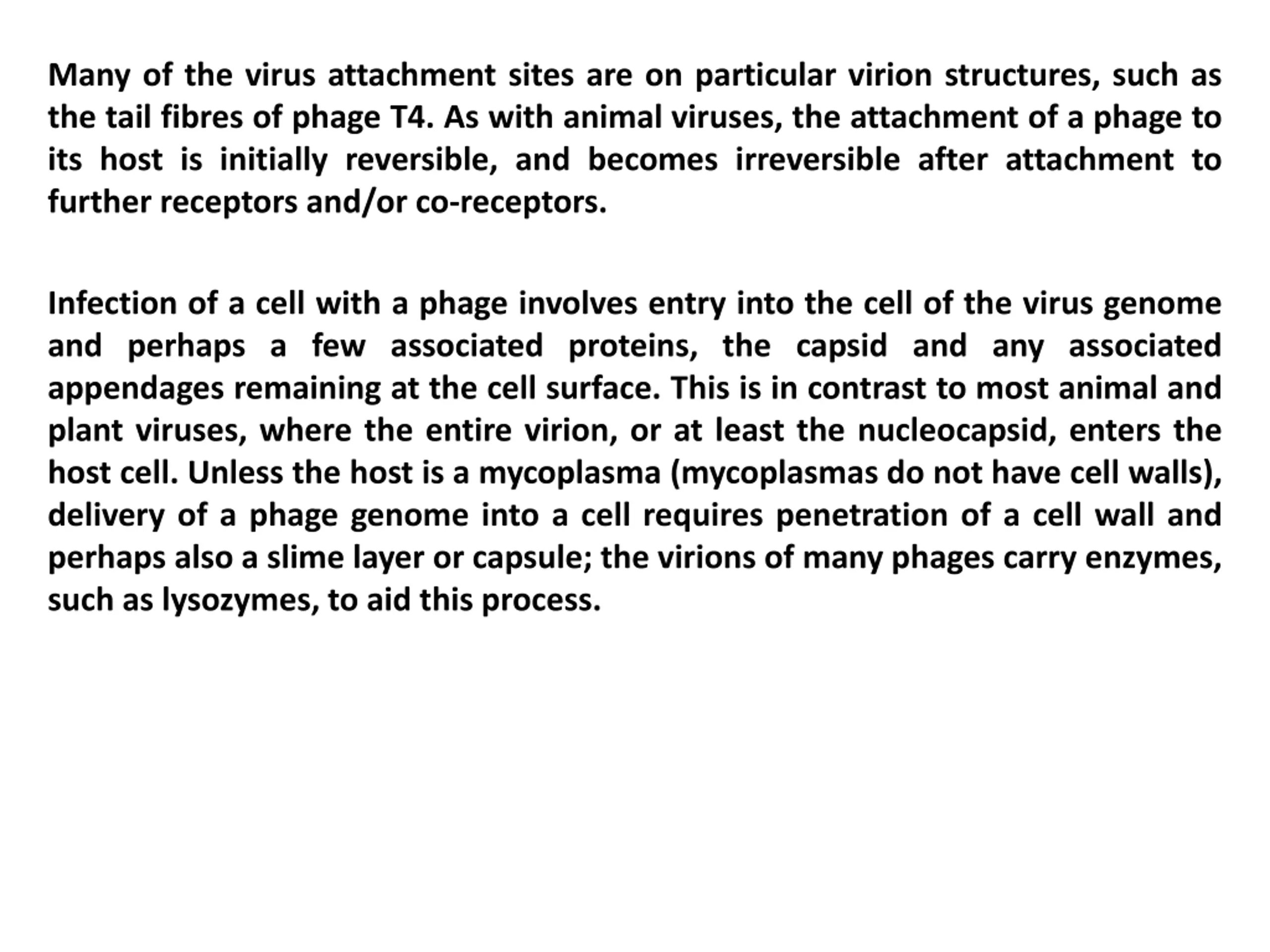 Many of the virus attachment sites are on particular virion structures, such as the tail fibres of phage T4. As with animal viruses, the attachment of a phage to its host is initially reversible, and becomes irreversible after attachment to further receptors and/or co-receptors. Infection of a cell with a phage involves entry into the cell of the virus genome and perhaps a few associated proteins, the capsid and any associated appendages remaining at the cell surface. This is in contrast to most animal and plant viruses, where the entire virion, or at least the nucleocapsid, enters the host cell. Unless the host is a mycoplasma (mycoplasmas do not have cell walls), delivery of a phage genome into a cell requires penetration of a cell wall and perhaps also a slime layer or capsule; the virions of many phages carry enzymes, such as lysozymes, to aid this process.