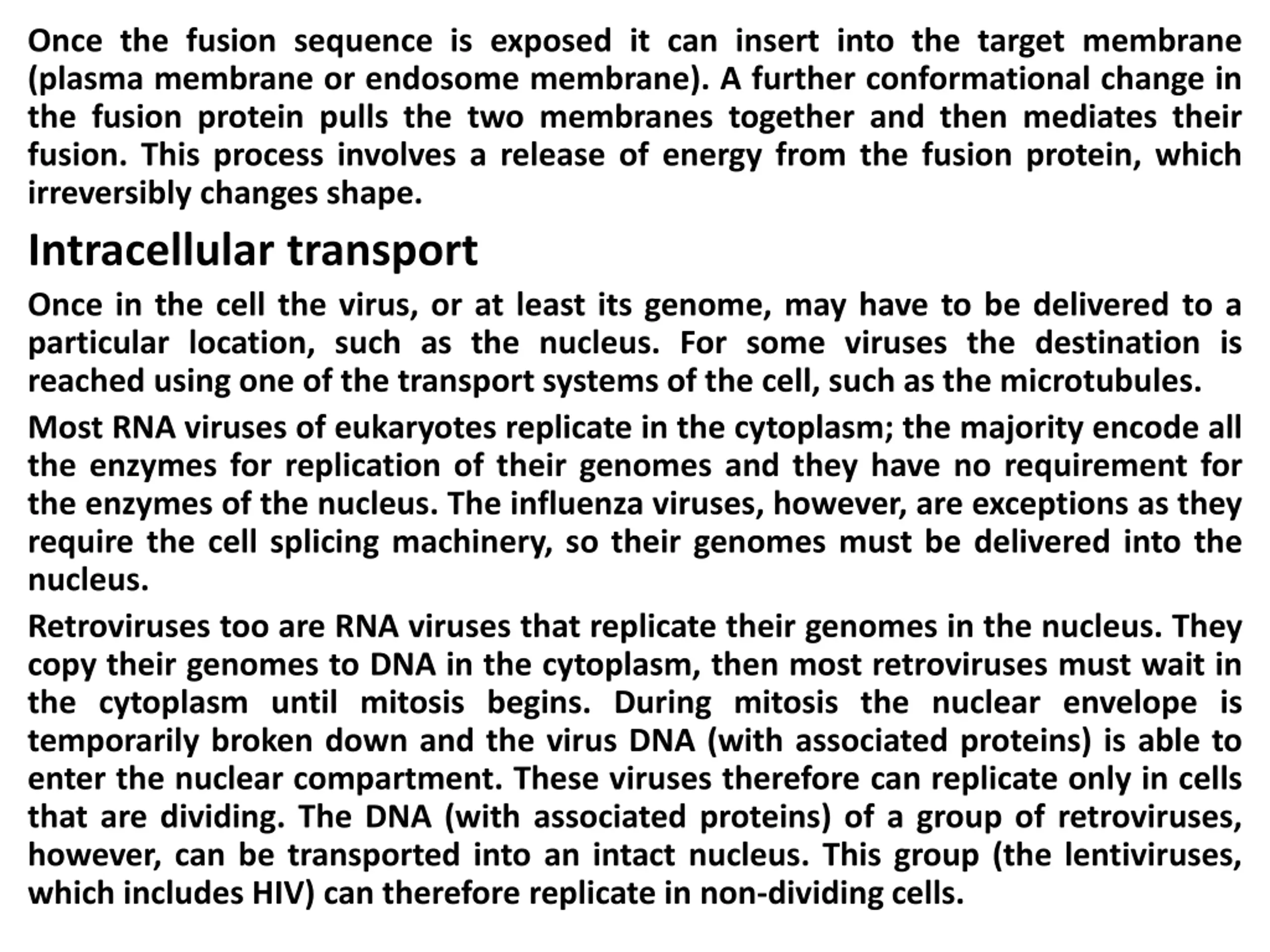 Once the fusion sequence is exposed it can insert into the target membrane (plasma membrane or endosome membrane). A further conformational change in the fusion protein pulls the two membranes together and then mediates their fusion. This process involves a release of energy from the fusion protein, which irreversibly changes shape. Intracellular transport Once in the cell the virus, or at least its genome, may have to be delivered to a particular location, such as the nucleus. For some viruses the destination is reached using one of the transport systems of the cell, such as the microtubules. Most RNA viruses of eukaryotes replicate in the cytoplasm; the majority encode all the enzymes for replication of their genomes and they have no requirement for the enzymes of the nucleus. The influenza viruses, however, are exceptions as they require the cell splicing machinery, so their genomes must be delivered into the nucleus. Retroviruses too are RNA viruses that replicate their genomes in the nucleus. They copy their genomes to DNA in the cytoplasm, then most retroviruses must wait in the cytoplasm until mitosis begins. During mitosis the nuclear envelope is temporarily broken down and the virus DNA (with associated proteins) is able to enter the nuclear compartment. These viruses therefore can replicate only in cells that are dividing. The DNA (with associated proteins) of a group of retroviruses, however, can be transported into an intact nucleus. This group (the lentiviruses, which includes HIV) can therefore replicate in non-dividing cells.