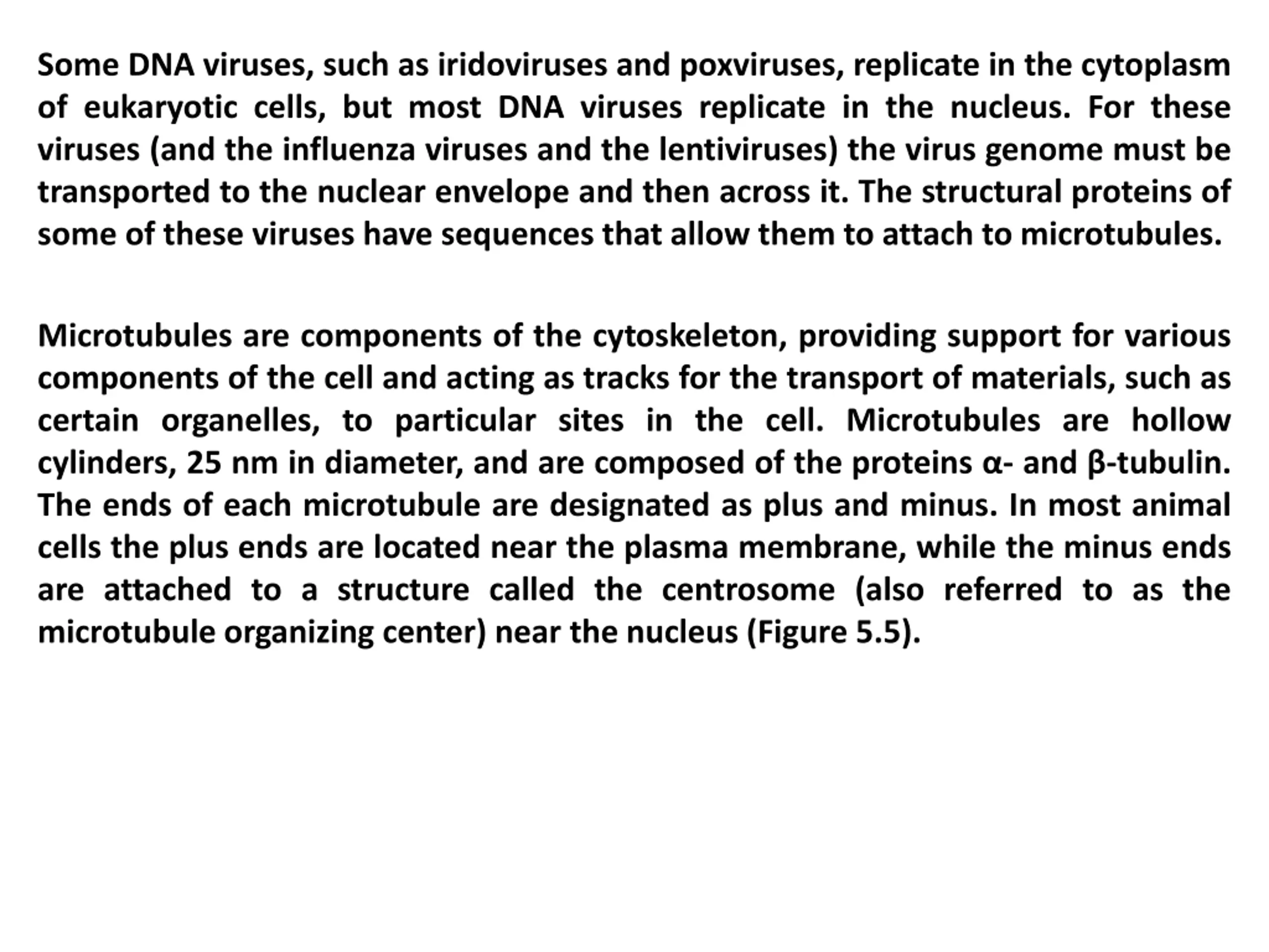 Some DNA viruses, such as iridoviruses and poxviruses, replicate in the cytoplasm of eukaryotic cells, but most DNA viruses replicate in the nucleus. For these viruses (and the influenza viruses and the lentiviruses) the virus genome must be transported to the nuclear envelope and then across it. The structural proteins of some of these viruses have sequences that allow them to attach to microtubules. Microtubules are components of the cytoskeleton, providing support for various components of the cell and acting as tracks for the transport of materials, such as certain organelles, to particular sites in the cell. Microtubules are hollow cylinders, 25 nm in diameter, and are composed of the proteins - and -tubulin. The ends of each microtubule are designated as plus and minus. In most animal cells the plus ends are located near the plasma membrane, while the minus ends are attached to a structure called the centrosome (also referred to as the microtubule organizing center) near the nucleus (Figure 5.5).