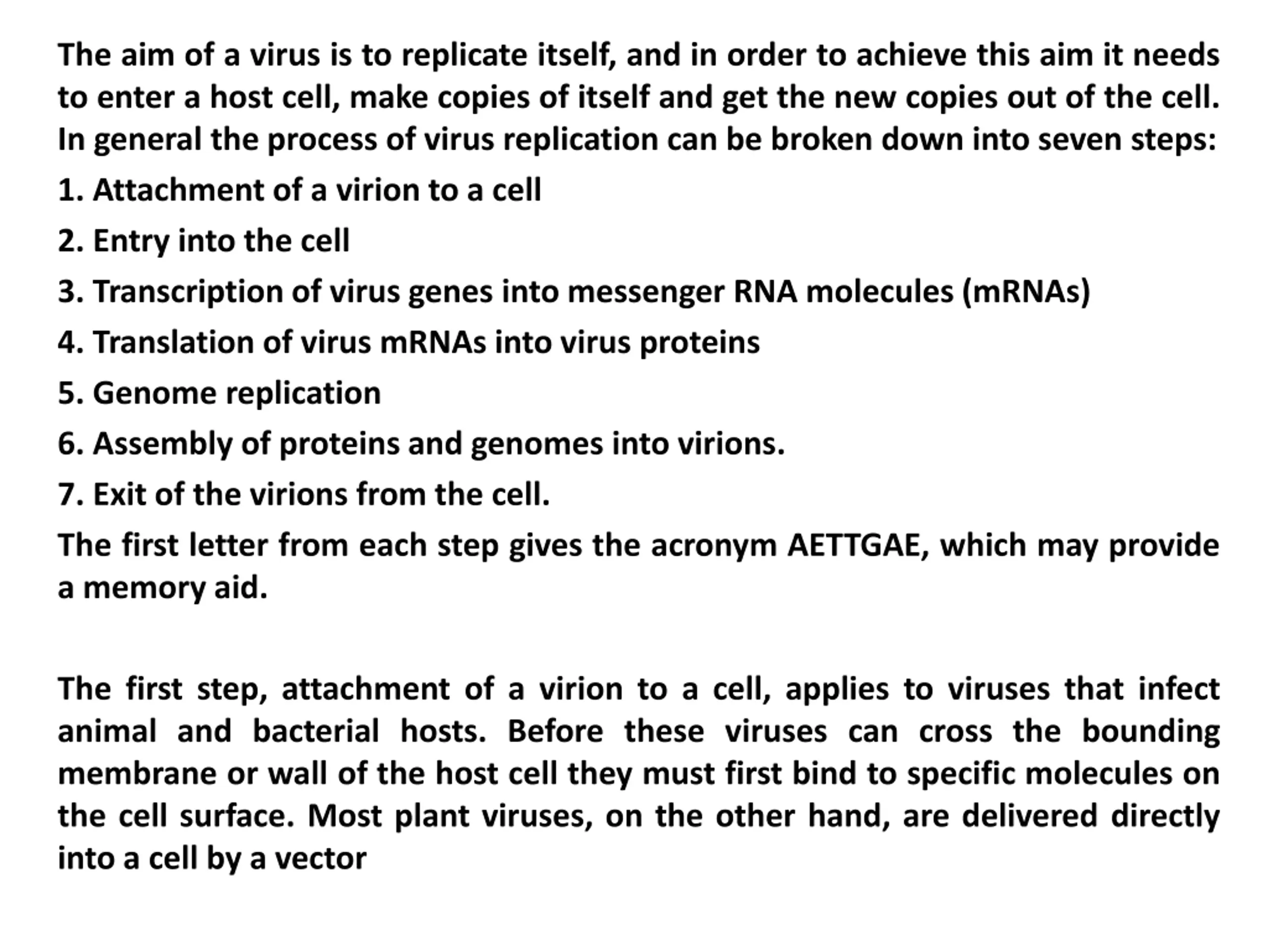 The aim of a virus is to replicate itself, and in order to achieve this aim it needs to enter a host cell, make copies of itself and get the new copies out of the cell. In general the process of virus replication can be broken down into seven steps: 1. Attachment of a virion to a cell 2. Entry into the cell 3. Transcription of virus genes into messenger RNA molecules (mRNAs) 4. Translation of virus mRNAs into virus proteins 5. Genome replication 6. Assembly of proteins and genomes into virions. 7. Exit of the virions from the cell. The first letter from each step gives the acronym AETTGAE, which may provide a memory aid. The first step, attachment of a virion to a cell, applies to viruses that infect animal and bacterial hosts. Before these viruses can cross the bounding membrane or wall of the host cell they must first bind to specific molecules on the cell surface. Most plant viruses, on the other hand, are delivered directly into a cell by a vector