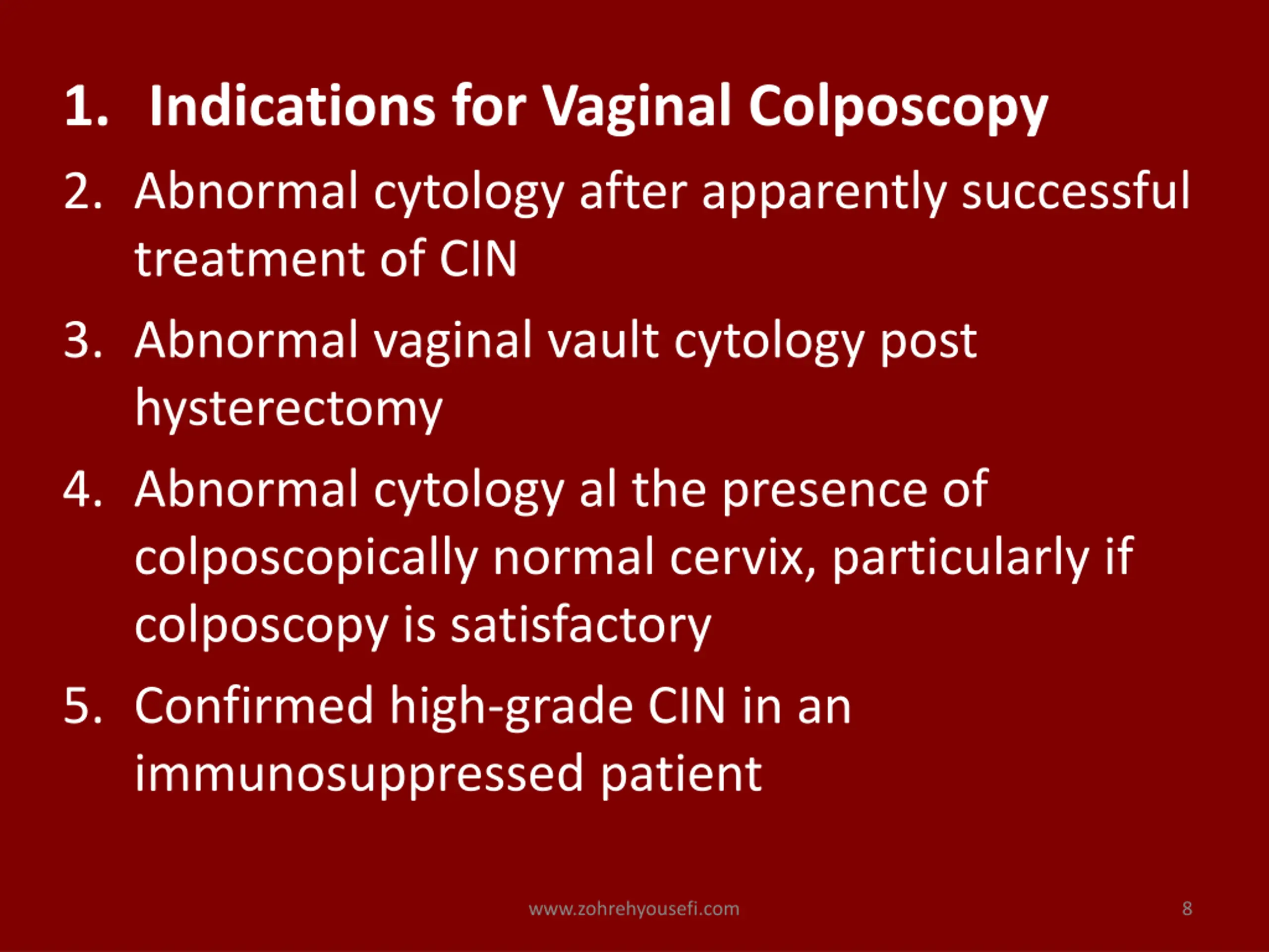 1. Indications for Vaginal Colposcopy 2. Abnormal cytology after apparently successful treatment of CIN 3. Abnormal vaginal vault cytology post hysterectomy 4. Abnormal cytology al the presence of colposcopically normal cervix, particularly if colposcopy is satisfactory 5. Confirmed high-grade CIN in an immunosuppressed patient www.zohrehyousefi.com 8
