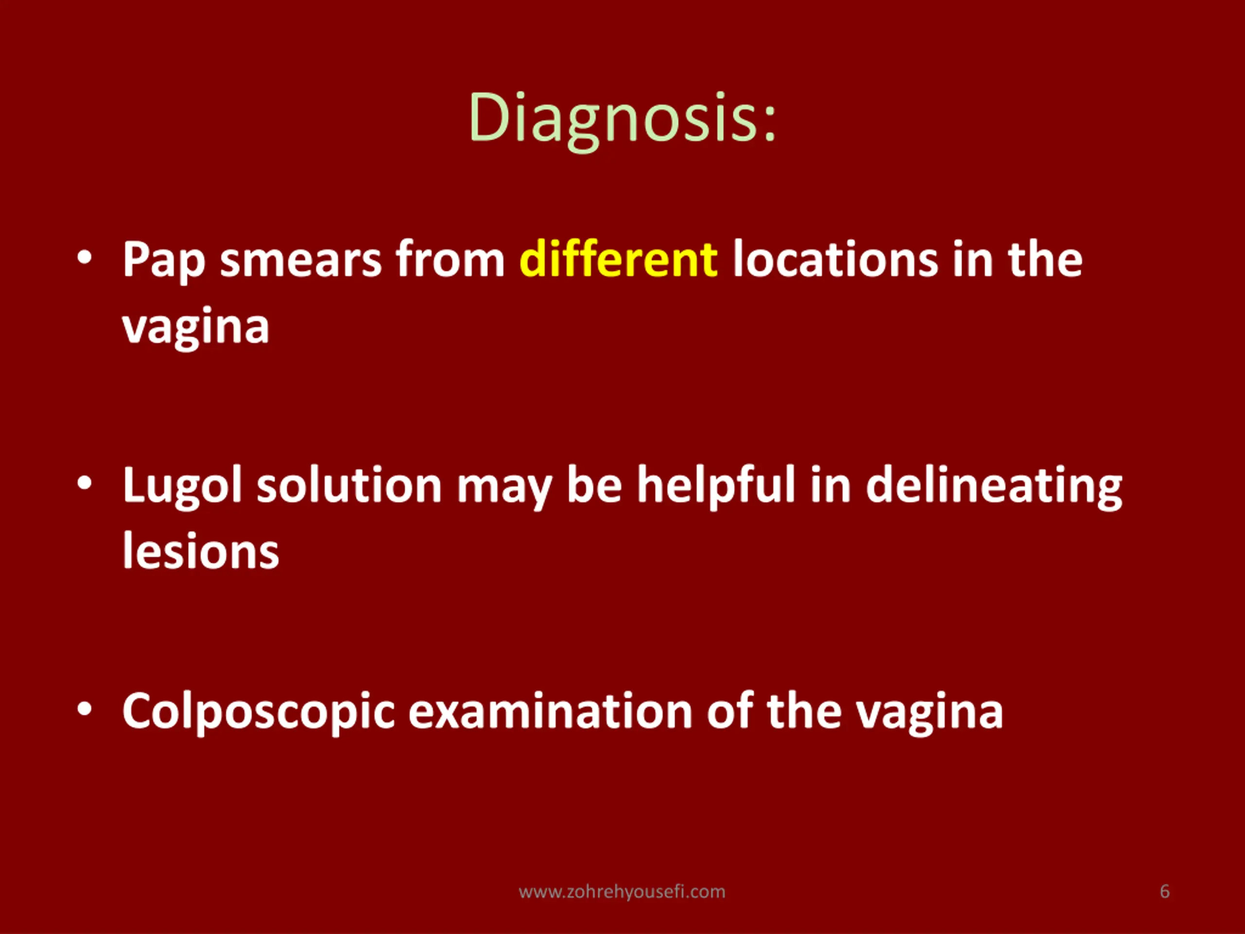 Diagnosis: Pap smears from different locations in the vagina Lugol solution may be helpful in delineating lesions Colposcopic examination of the vagina www.zohrehyousefi.com 6