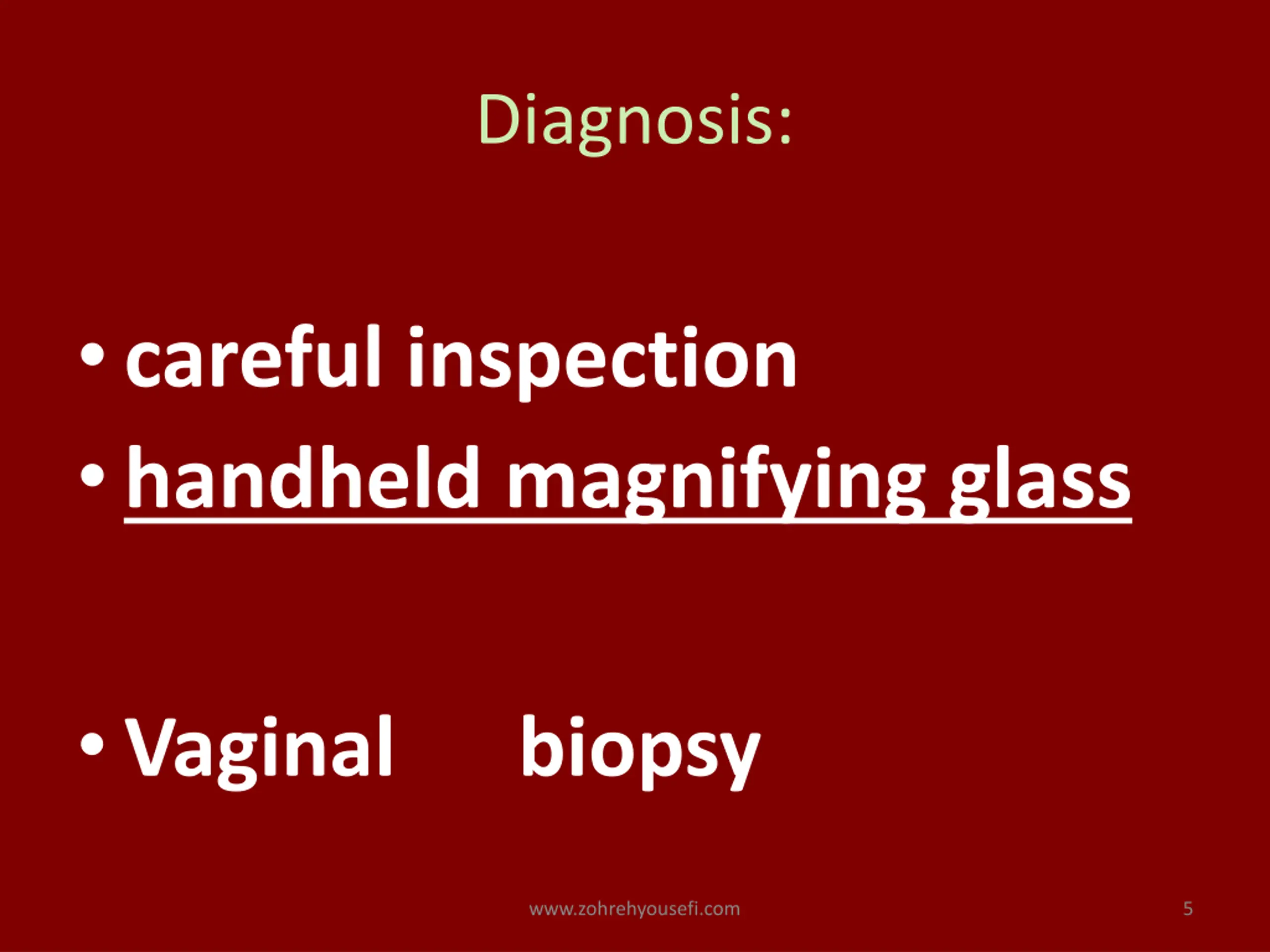 Diagnosis: careful inspection handheld magnifying glass Vaginal biopsy www.zohrehyousefi.com 5