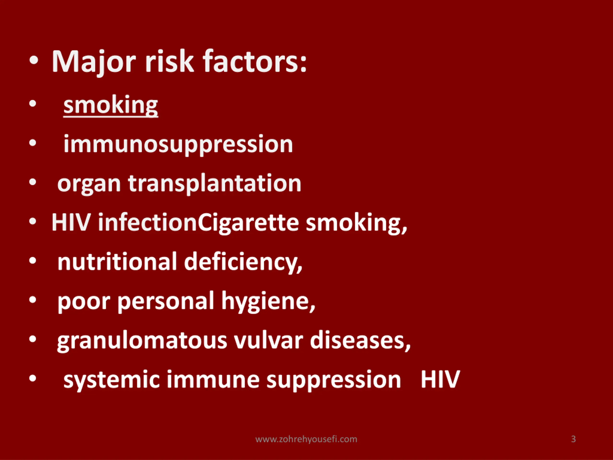Major risk factors: smoking immunosuppression organ transplantation HIV infectionCigarette smoking, nutritional deficiency, poor personal hygiene, granulomatous vulvar diseases, systemic immune suppression HIV www.zohrehyousefi.com 3