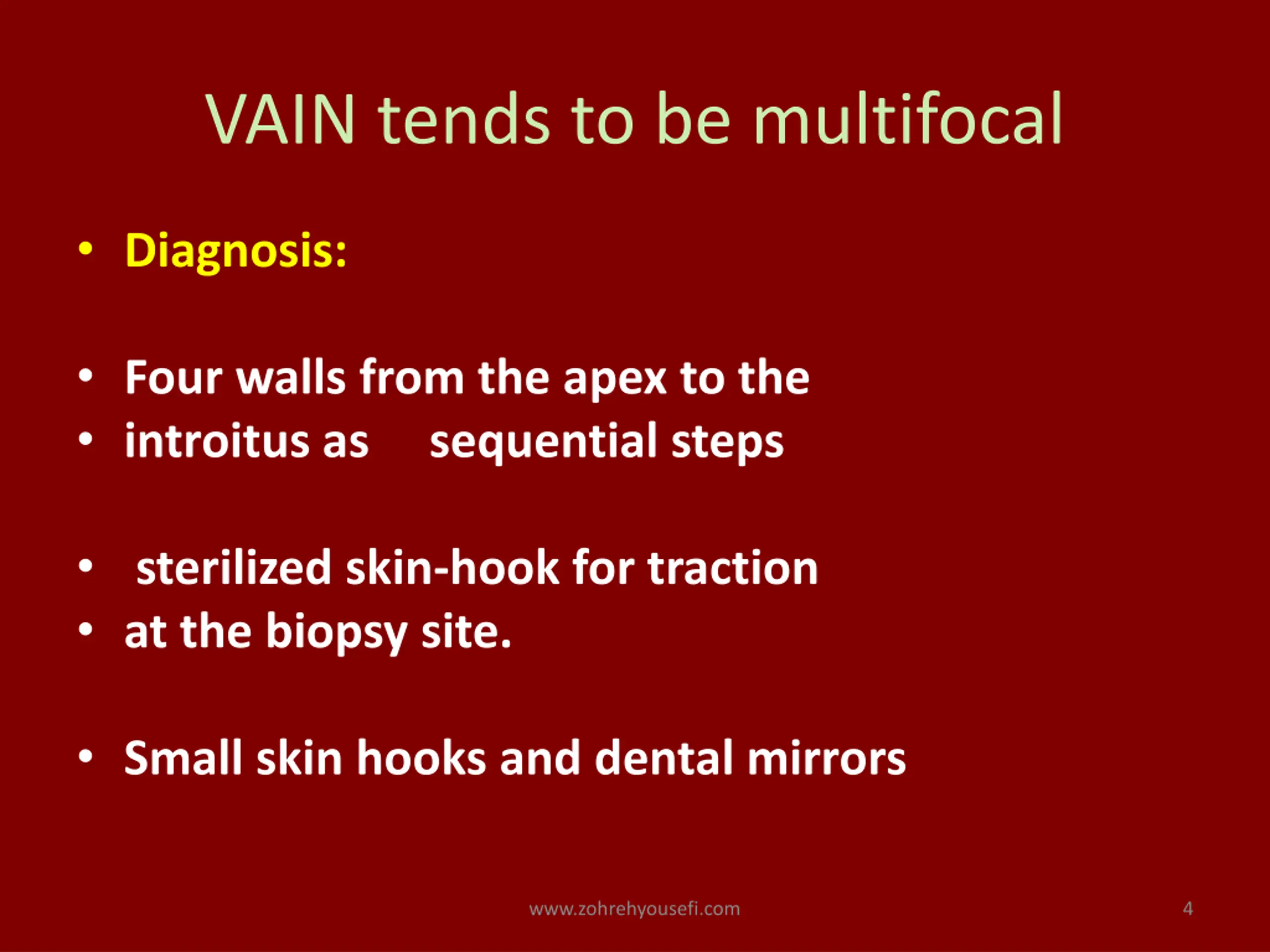 VAIN tends to be multifocal Diagnosis: Four walls from the apex to the introitus as sequential steps sterilized skin-hook for traction at the biopsy site. Small skin hooks and dental mirrors www.zohrehyousefi.com 4