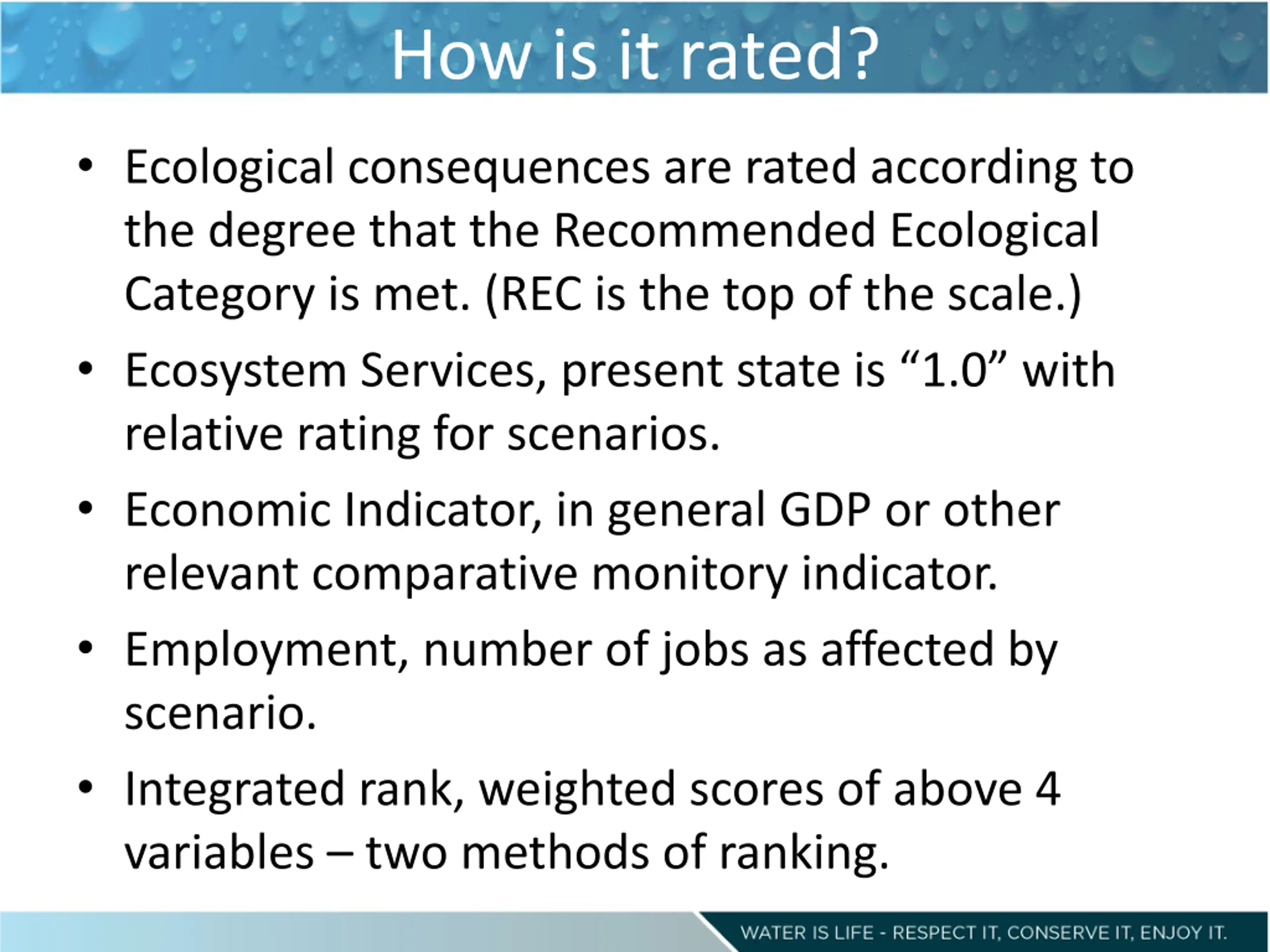 How is it rated? Ecological consequences are rated according to the degree that the Recommended Ecological Category is met. (REC is the top of the scale.) Ecosystem Services, present state is 1.0 with relative rating for scenarios. Economic Indicator, in general GDP or other relevant comparative monitory indicator. Employment, number of jobs as affected by scenario. Integrated rank, weighted scores of above 4 variables two methods of ranking.