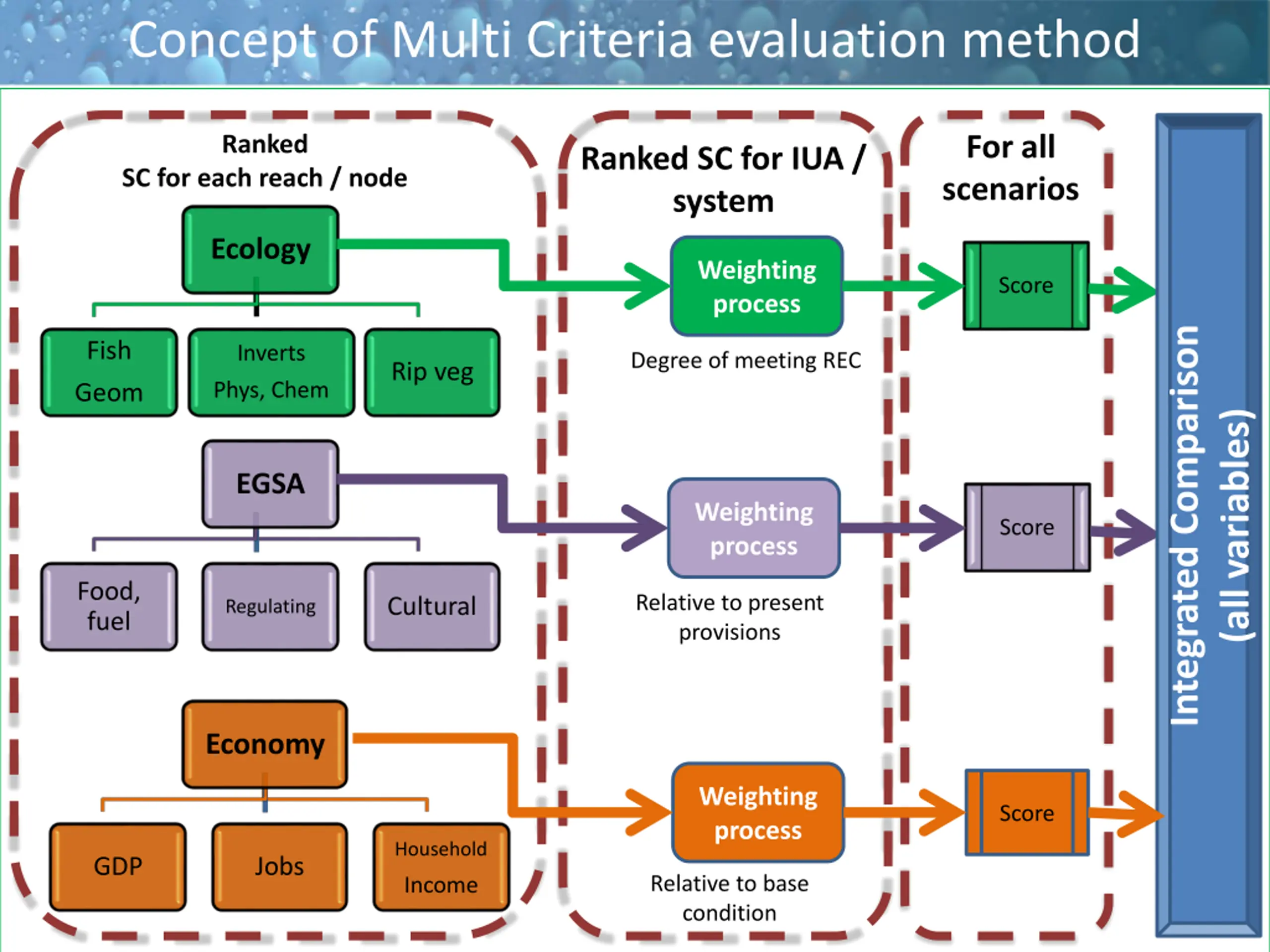 Integrated Comparison Concept of Multi Criteria evaluation method For all scenarios Ranked Ranked SC for IUA / system SC for each reach / node Ecology Weighting process Score Fish Inverts Phys, Chem Degree of meeting REC Rip veg Geom (all variables) EGSA Weighting process Score Food, fuel Relative to present provisions Cultural Regulating Economy Weighting process Score Household Income GDP Jobs Relative to base condition