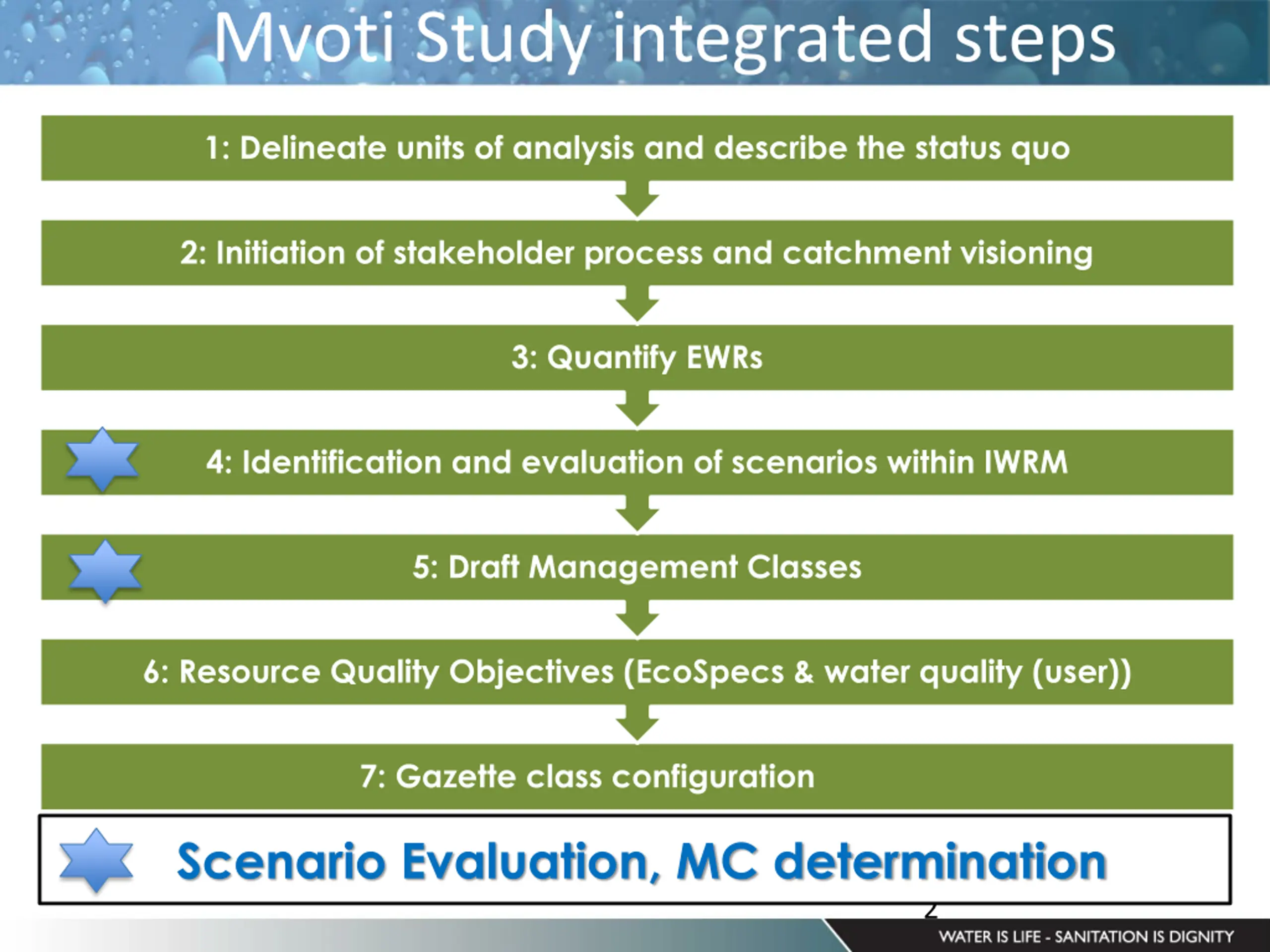 Mvoti Study integrated steps 1: Delineate units of analysis and describe the status quo 2: Initiation of stakeholder process and catchment visioning 3: Quantify EWRs 4: Identification and evaluation of scenarios within IWRM 5: Draft Management Classes 6: Resource Quality Objectives (EcoSpecs & water quality (user)) 7: Gazette class configuration Scenario Evaluation, MC determination 2