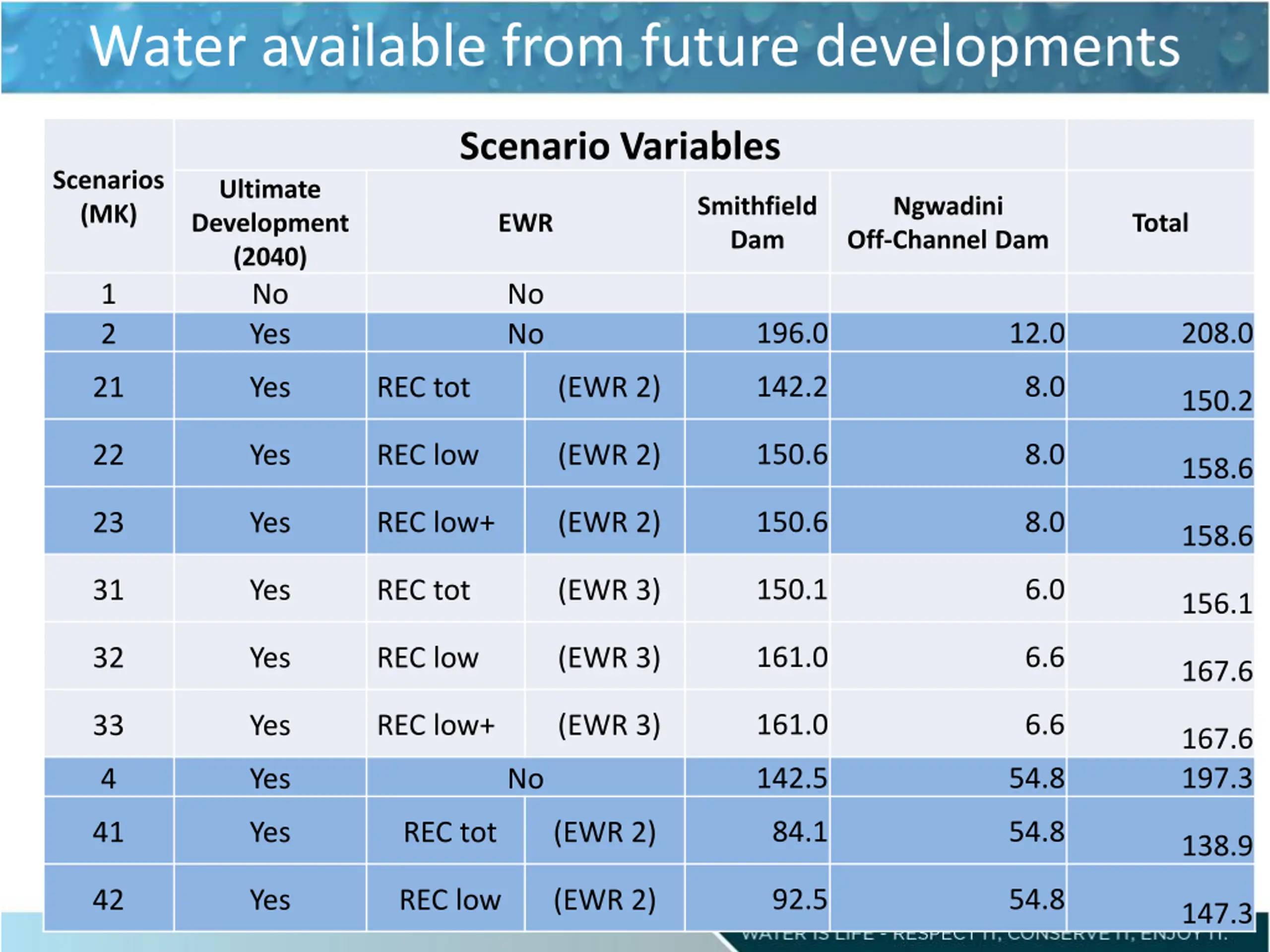 Water available from future developments Scenario Variables Scenarios (MK) Ultimate Development (2040) No Yes Smithfield Dam Ngwadini Off-Channel Dam EWR Total 1 2 No No 196.0 12.0 208.0 142.2 8.0 REC tot (EWR 2) 21 Yes 150.2 150.6 8.0 REC low (EWR 2) 22 Yes 158.6 150.6 8.0 REC low+ (EWR 2) 23 Yes 158.6 150.1 6.0 REC tot (EWR 3) 31 Yes 156.1 161.0 6.6 REC low (EWR 3) 32 Yes 167.6 161.0 6.6 REC low+ (EWR 3) 33 Yes 167.6 197.3 142.5 54.8 4 Yes No 84.1 54.8 REC tot 41 Yes (EWR 2) 138.9 92.5 54.8 REC low 42 Yes (EWR 2) 147.3
