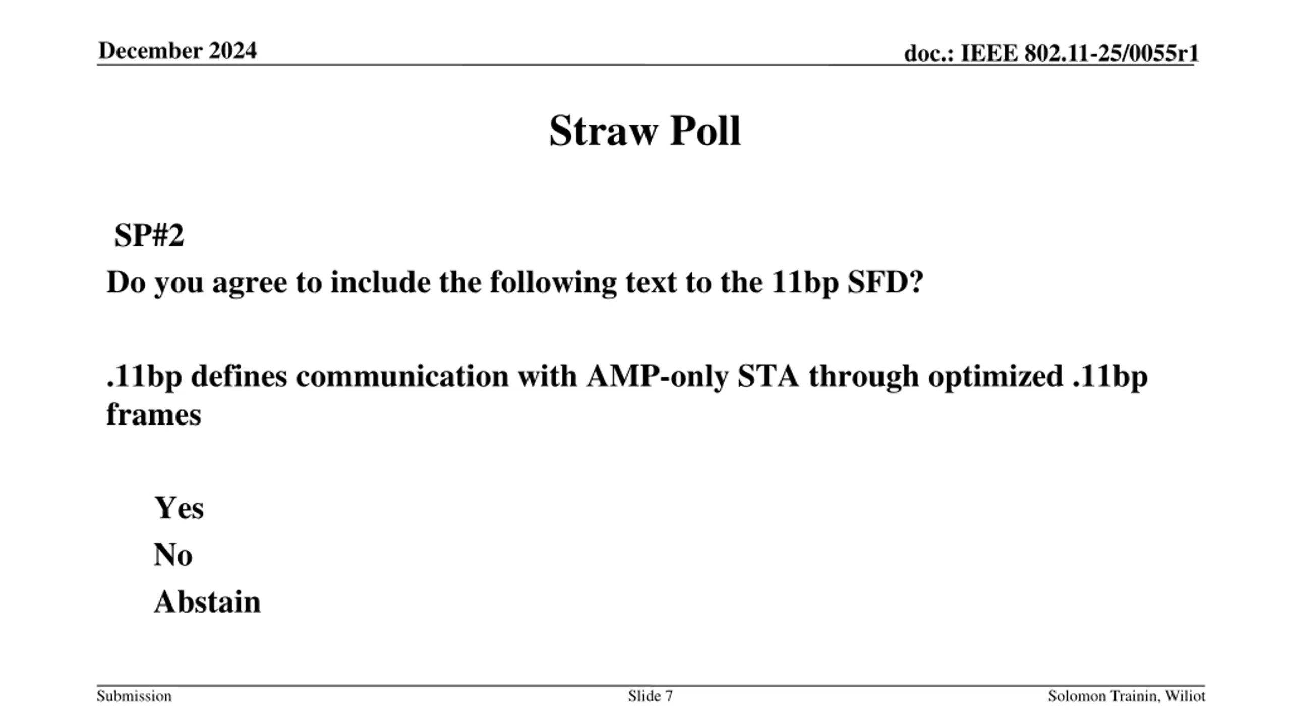 December 2024 doc.: IEEE 802.11-25/0055r1 Straw Poll SP#2 Do you agree to include the following text to the 11bp SFD? .11bp defines communication with AMP-only STA through optimized .11bp frames Yes No Abstain Submission Slide 7 Solomon Trainin, Wiliot