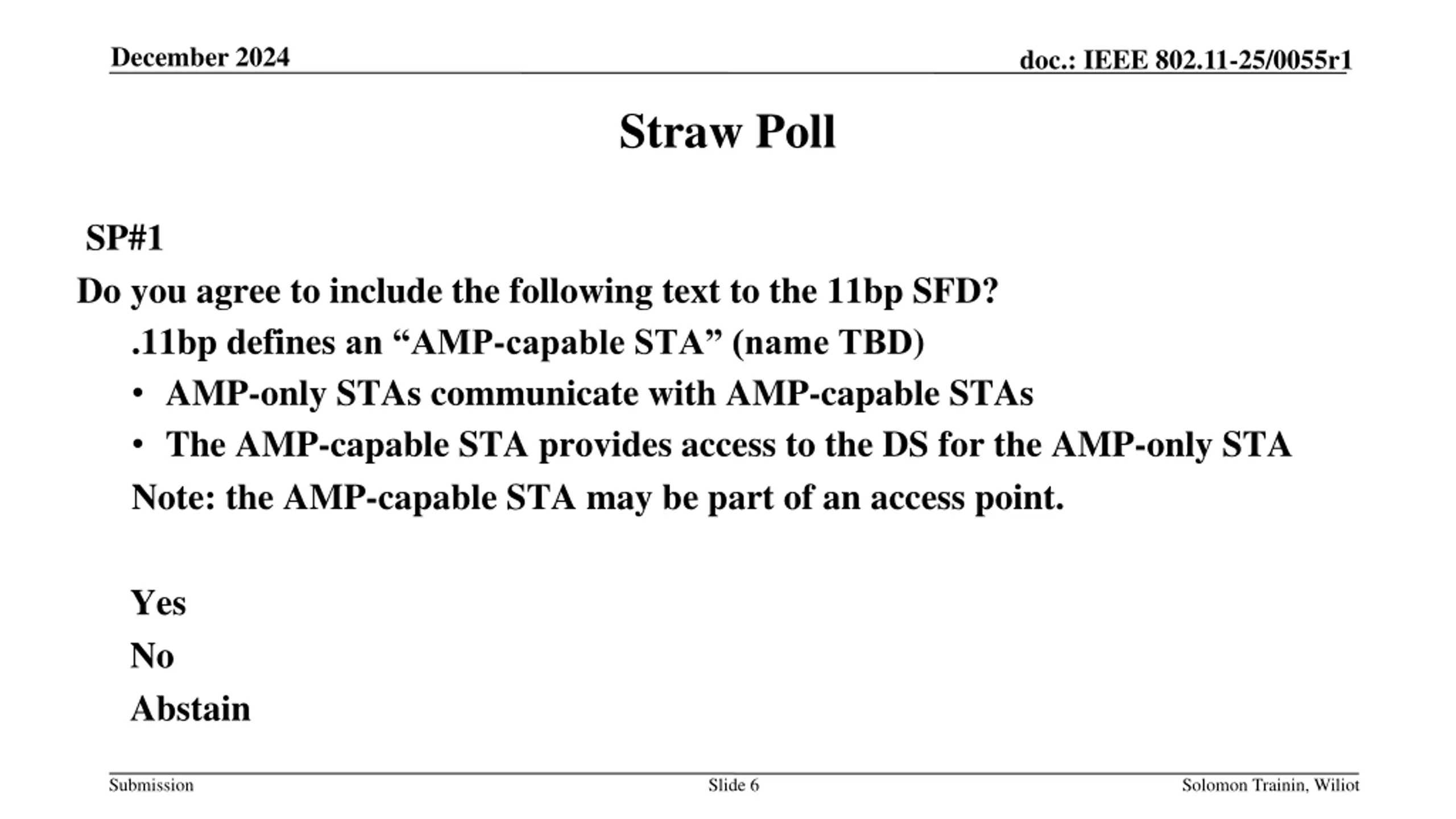 December 2024 doc.: IEEE 802.11-25/0055r1 Straw Poll SP#1 Do you agree to include the following text to the 11bp SFD? .11bp defines an AMP-capable STA (name TBD) AMP-only STAs communicate with AMP-capable STAs The AMP-capable STA provides access to the DS for the AMP-only STA Note: the AMP-capable STA may be part of an access point. Yes No Abstain Submission Slide 6 Solomon Trainin, Wiliot