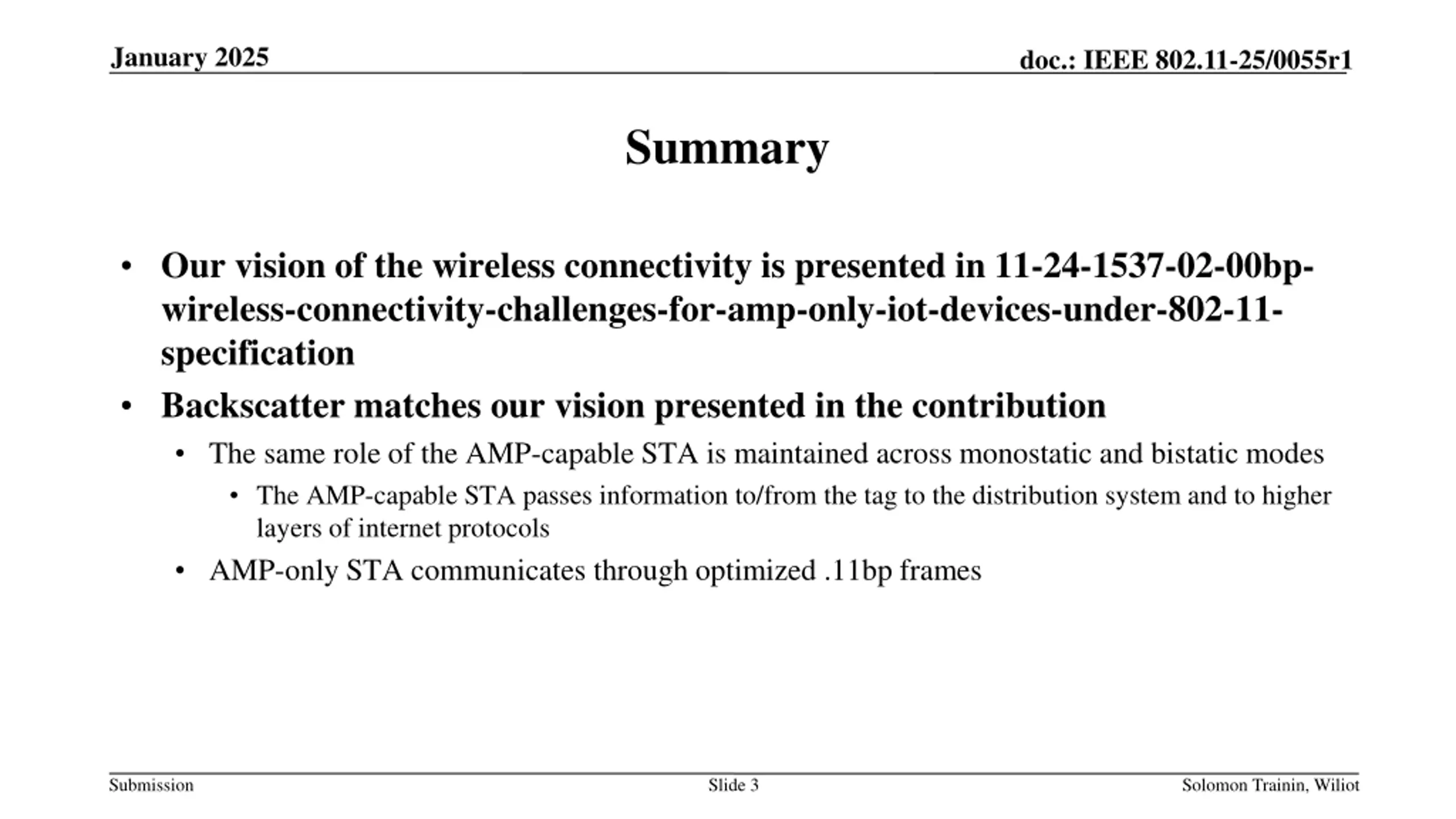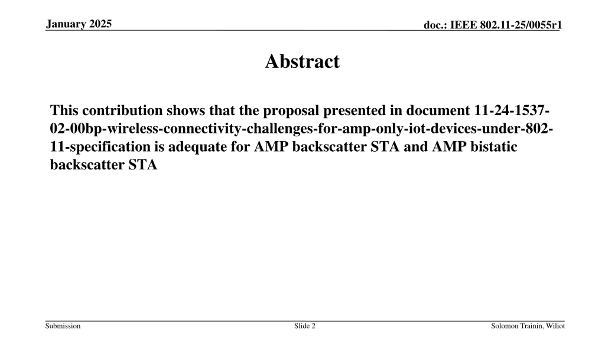 January 2025 doc.: IEEE 802.11-25/0055r1 Abstract This contribution shows that the proposal presented in document 11-24-1537- 02-00bp-wireless-connectivity-challenges-for-amp-only-iot-devices-under-802- 11-specification is adequate for AMP backscatter STA and AMP bistatic backscatter STA Submission Slide 2 Solomon Trainin, Wiliot