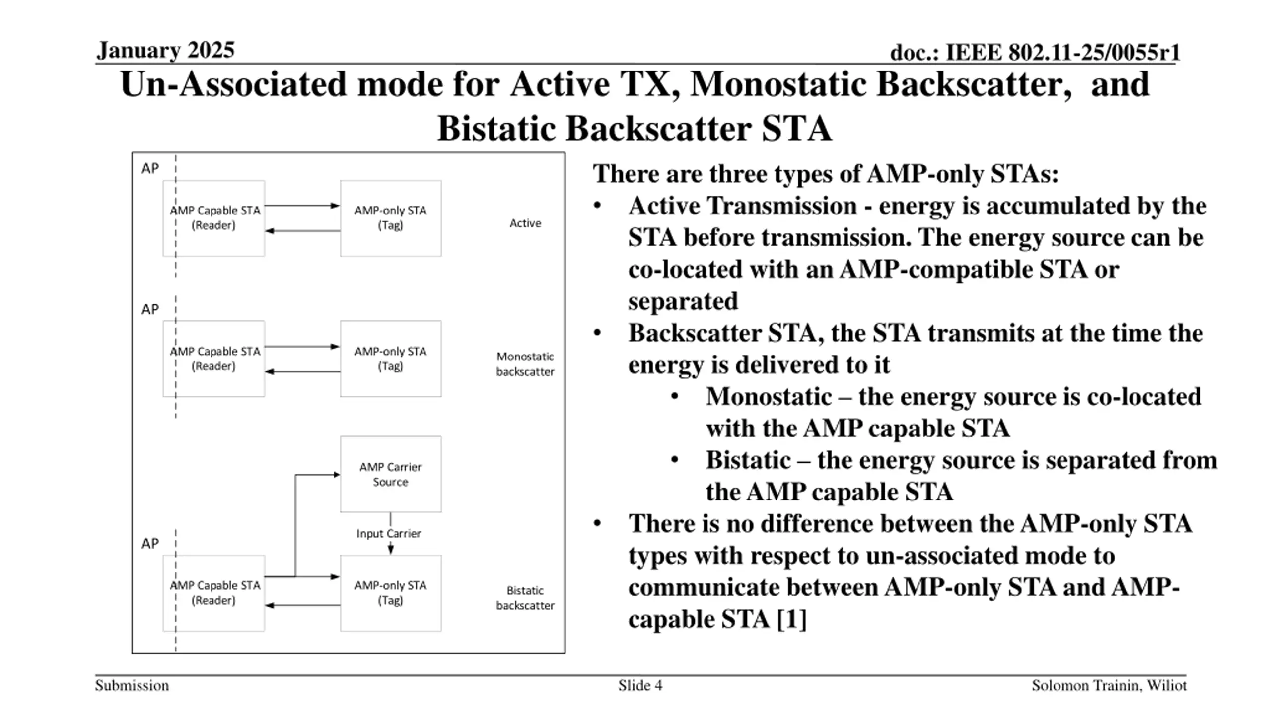 January 2025 doc.: IEEE 802.11-25/0055r1 Un-Associated mode for Active TX, Monostatic Backscatter, and Bistatic Backscatter STA There are three types of AMP-only STAs: Active Transmission - energy is accumulated by the STA before transmission. The energy source can be co-located with an AMP-compatible STA or separated Backscatter STA, the STA transmits at the time the energy is delivered to it AP AMP Capable STA (Reader) AMP-only STA (Tag) Active AP AMP Capable STA (Reader) AMP-only STA (Tag) Monostatic backscatter Monostatic the energy source is co-located with the AMP capable STA Bistatic the energy source is separated from the AMP capable STA There is no difference between the AMP-only STA types with respect to un-associated mode to communicate between AMP-only STA and AMP- capable STA [1] AMP Carrier Source Input Carrier AP AMP Capable STA (Reader) AMP-only STA (Tag) Bistatic backscatter Submission Slide 4 Solomon Trainin, Wiliot